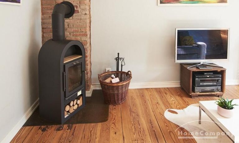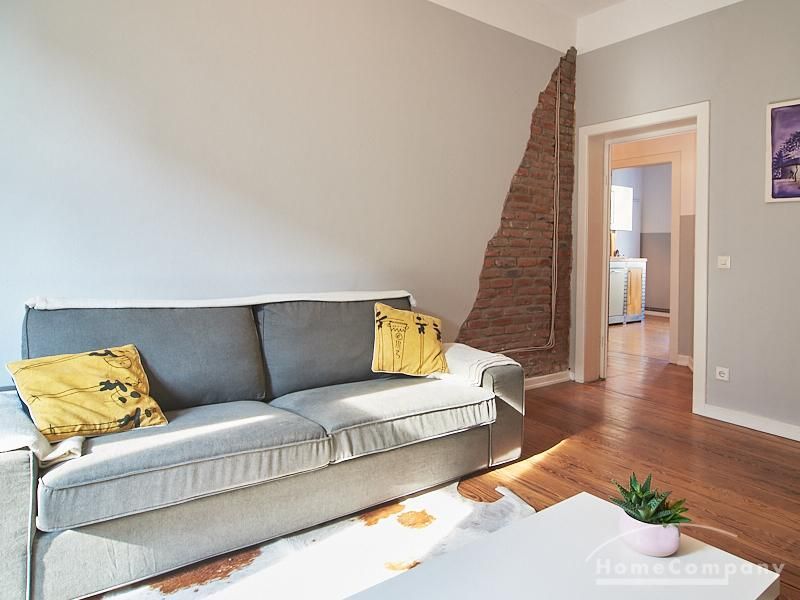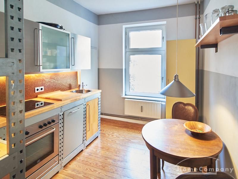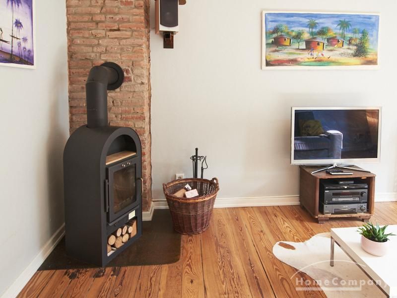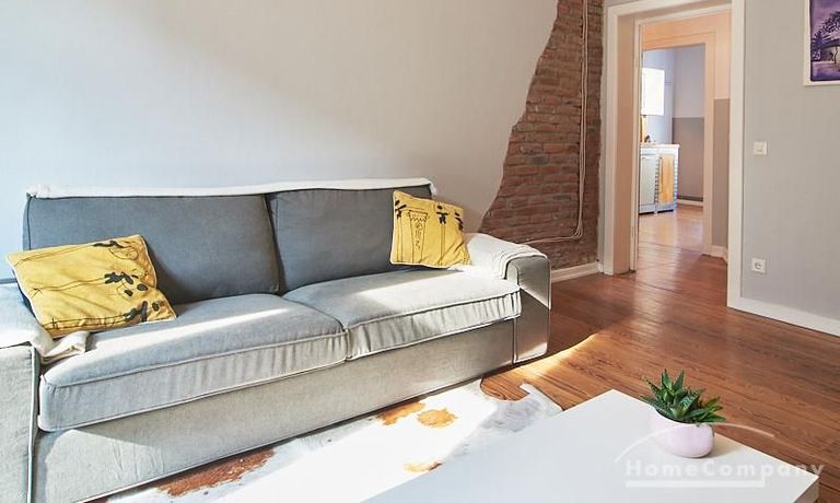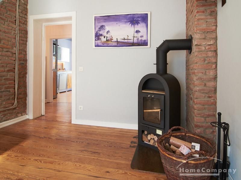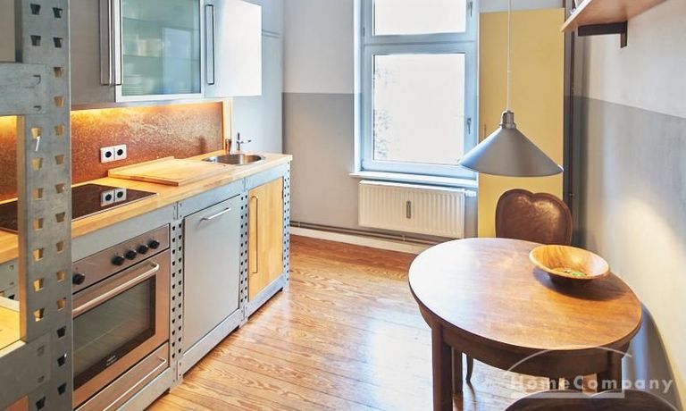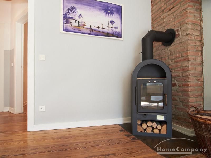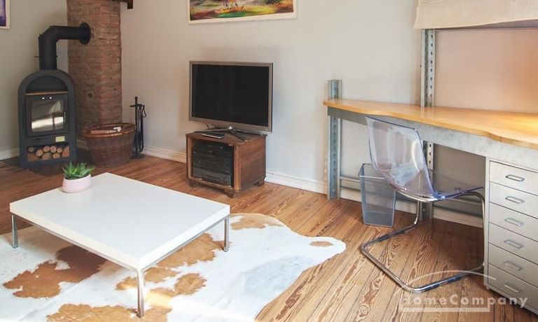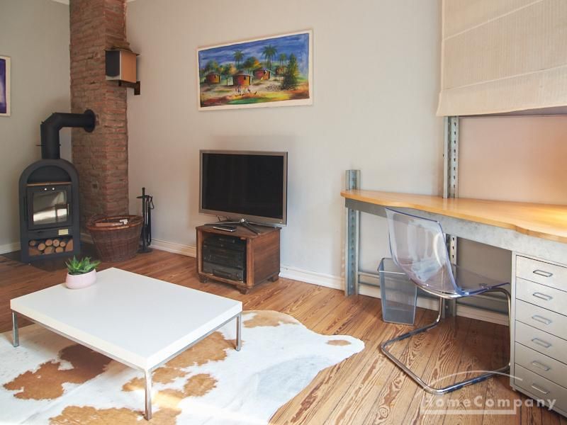 Schön gestaltete Altbauwohnung mit Holzdielenboden und Kaminofen in Ottensen. Teilweise unverputzte Backsteinwände setzen spannende Akzente zur modernen Möblierung. Viele Möbelstücke sind Maßanfertigungen. Ein Kaminofen bietet die Möglichkeit nach Feierabend im Schein des Kaminfeuers zu entspannen. Im Wohnzimmer steht ein großer Sofabereich zur Verfügung. Ein Esstisch für zwei Personen steht in der gut ausgestatteten Küche zur Verfügung. Von hier abgehend befindet sich eine kleine Abstellkammer, in welcher die Waschmaschine steht. Das ruhig nach hinten gelegene Schlafzimmer ist mit einem 1,40 m breiten Bett und Kleiderschrank ausgestattet.