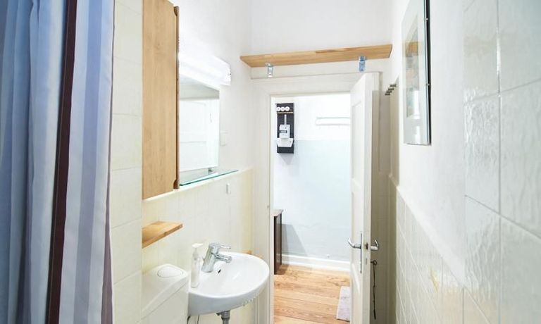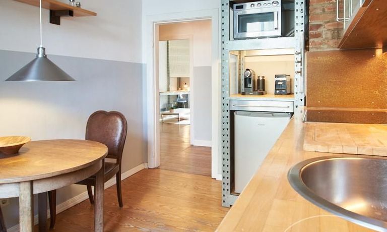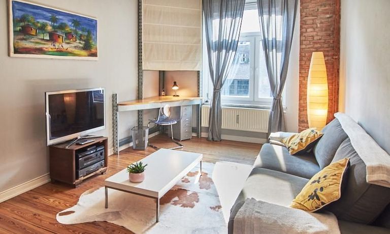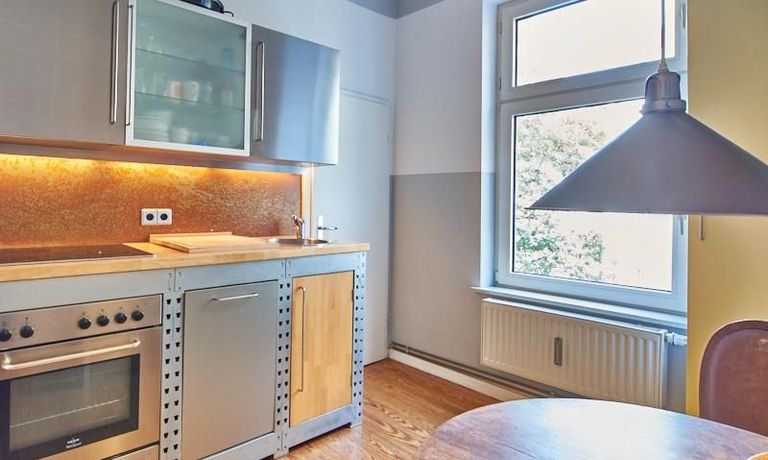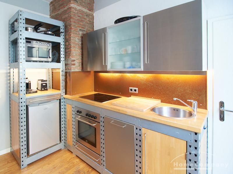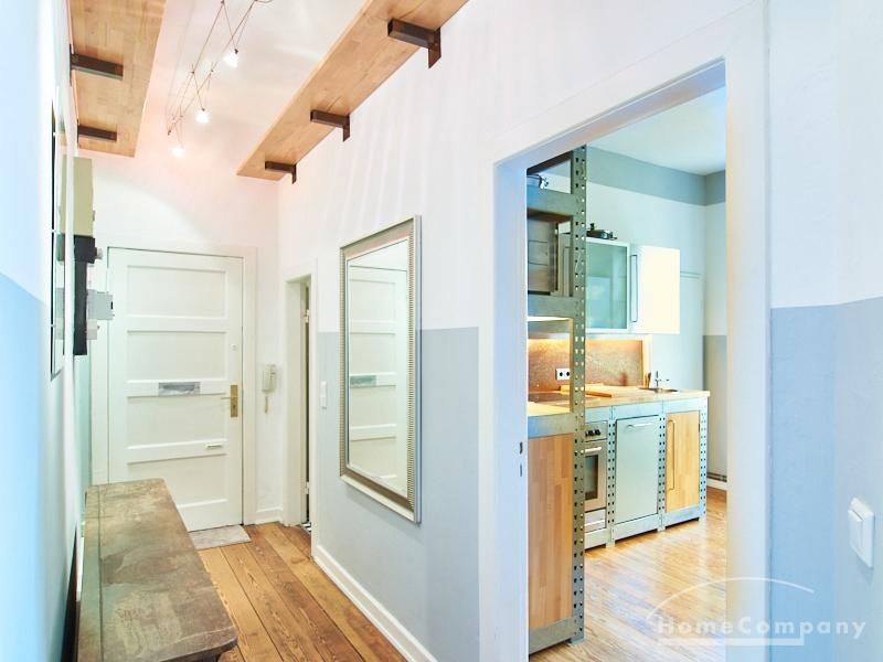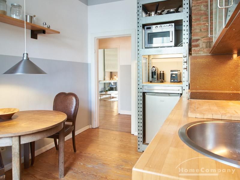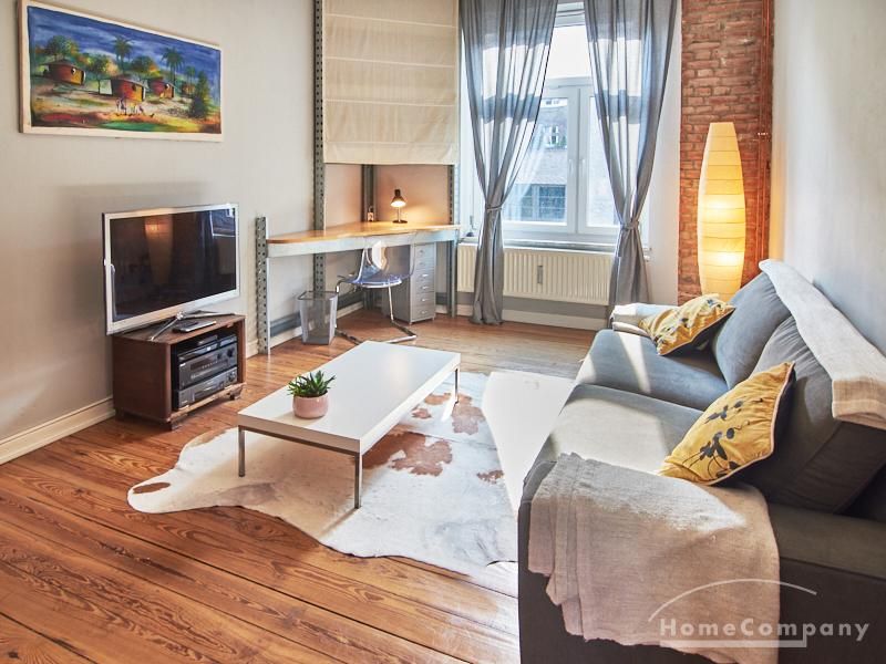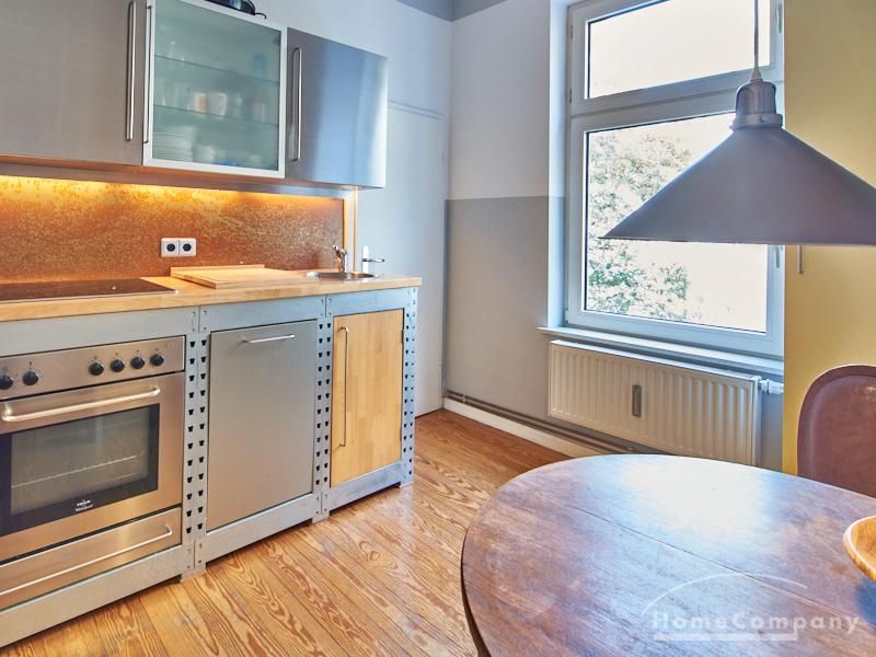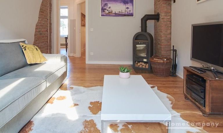 Schön gestaltete Altbauwohnung mit Holzdielenboden und Kaminofen in Ottensen. Teilweise unverputzte Backsteinwände setzen spannende Akzente zur modernen Möblierung. Viele Möbelstücke sind Maßanfertigungen. Ein Kaminofen bietet die Möglichkeit nach Feierabend im Schein des Kaminfeuers zu entspannen. Im Wohnzimmer steht ein großer Sofabereich zur Verfügung. Ein Esstisch für zwei Personen steht in der gut ausgestatteten Küche zur Verfügung. Von hier abgehend befindet sich eine kleine Abstellkammer, in welcher die Waschmaschine steht. Das ruhig nach hinten gelegene Schlafzimmer ist mit einem 1,40 m breiten Bett und Kleiderschrank ausgestattet.