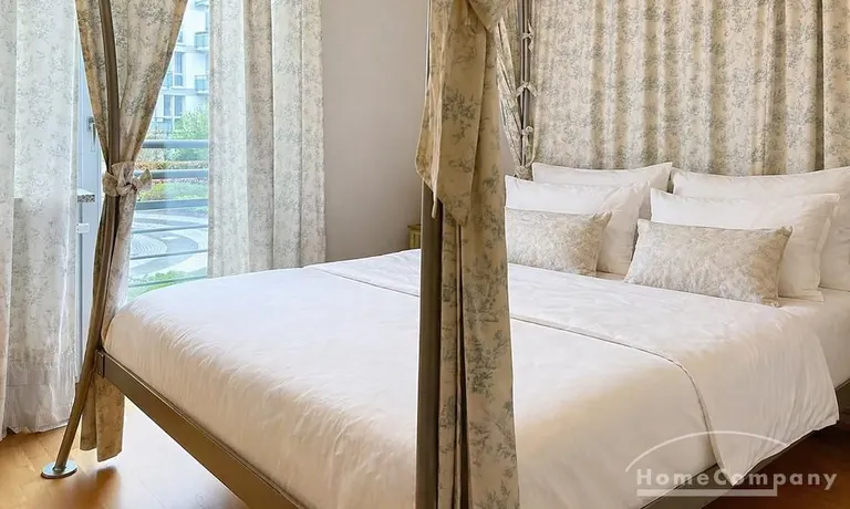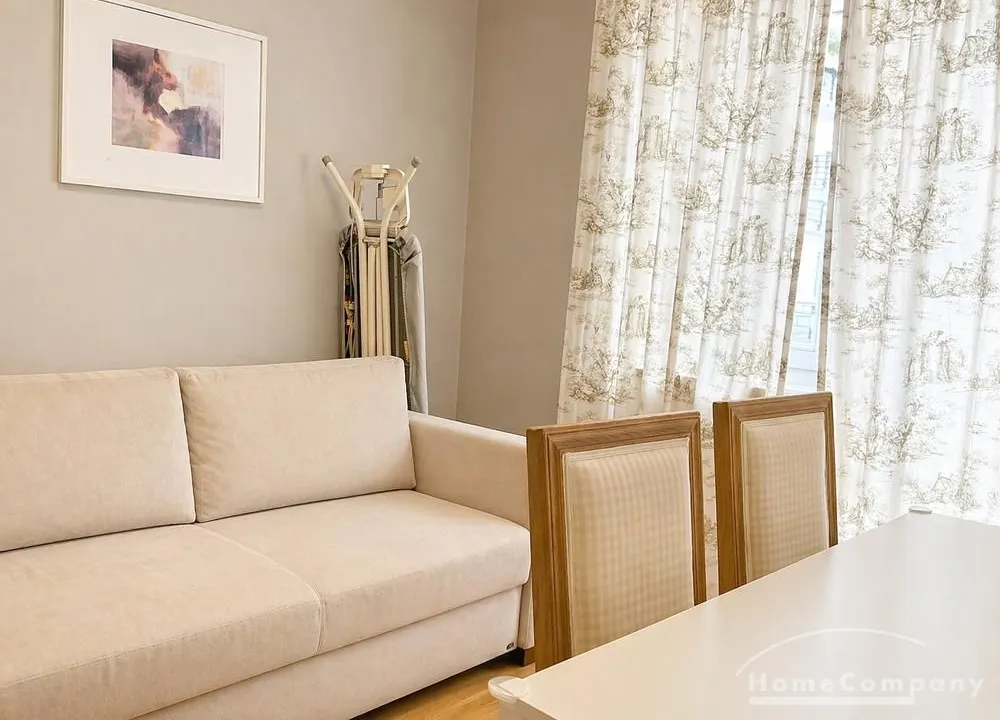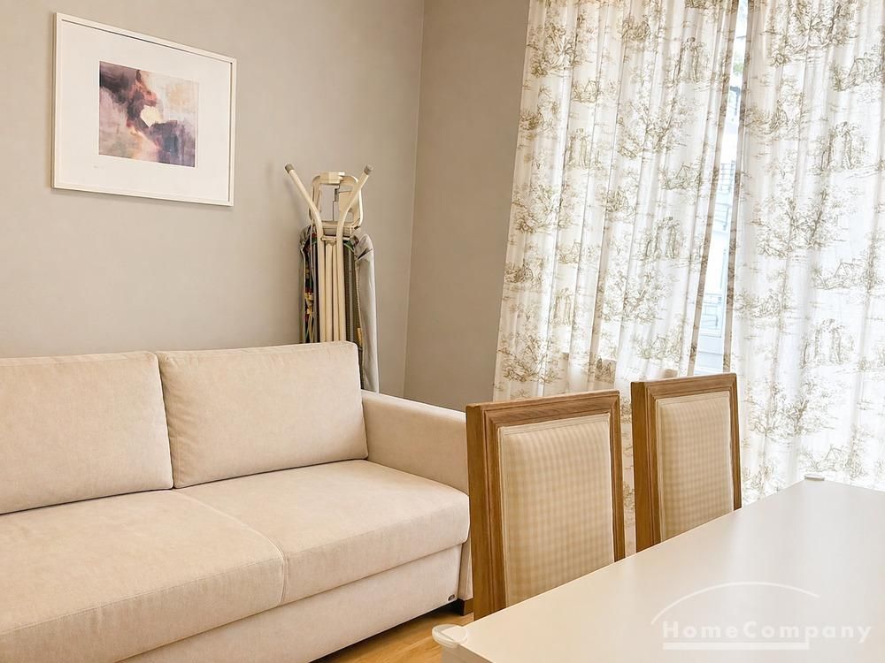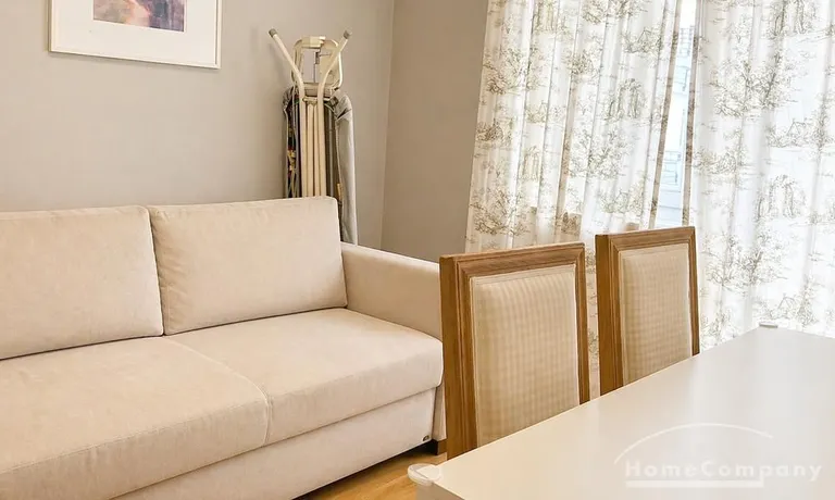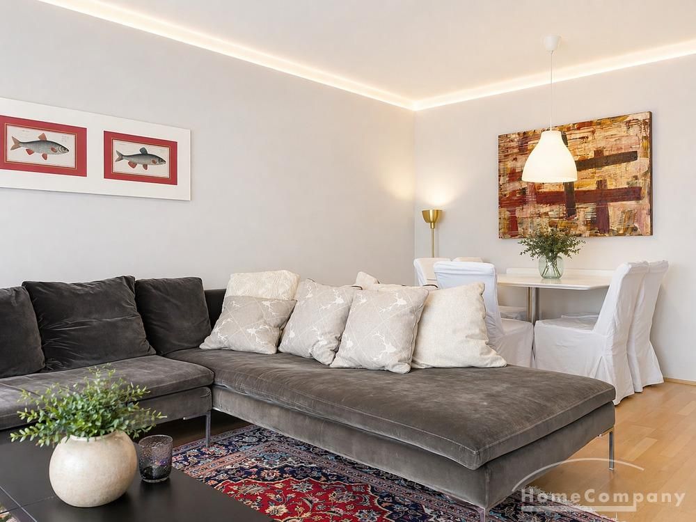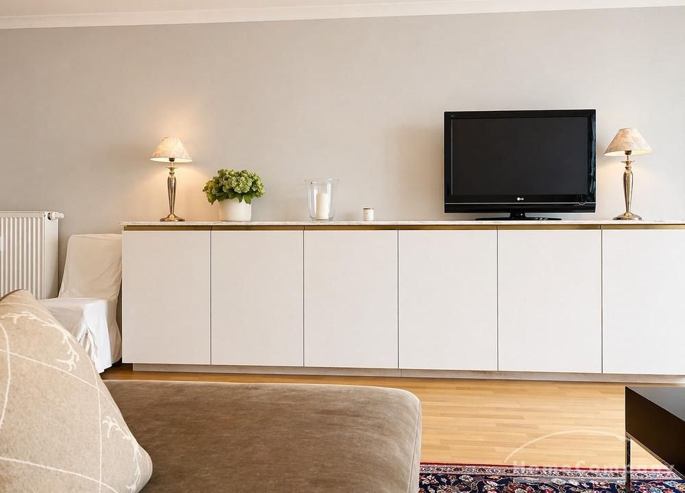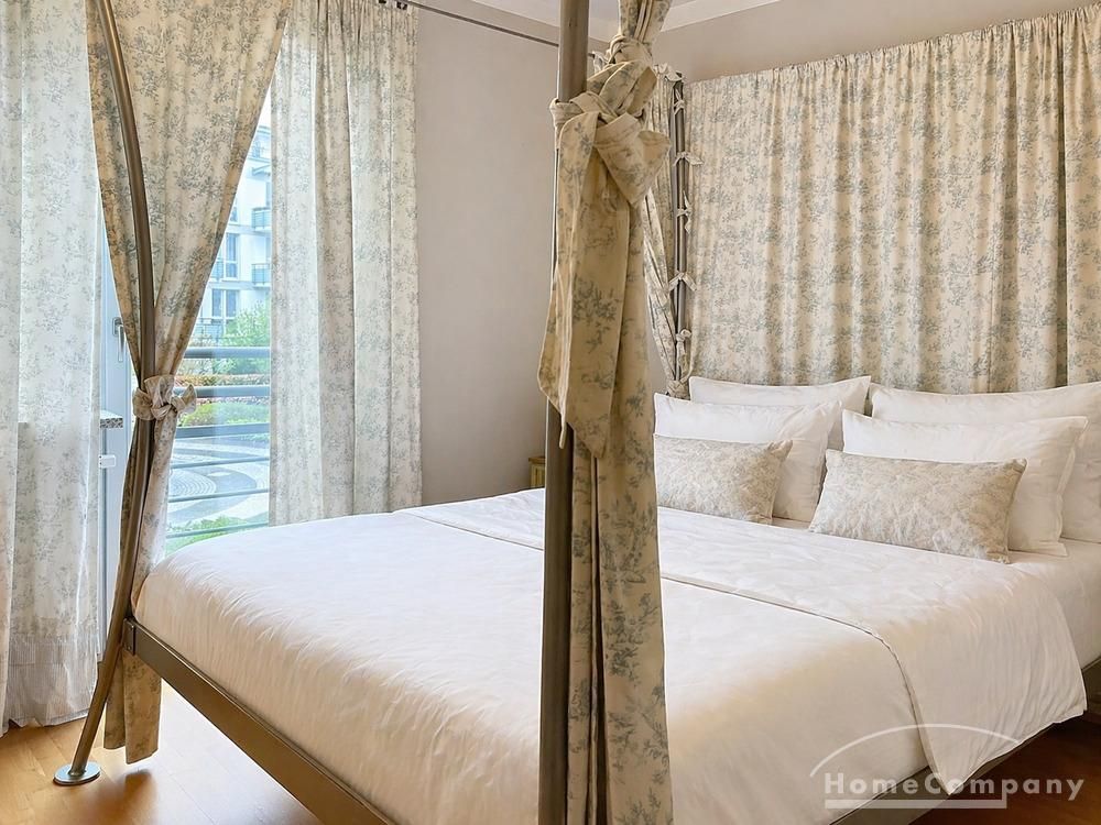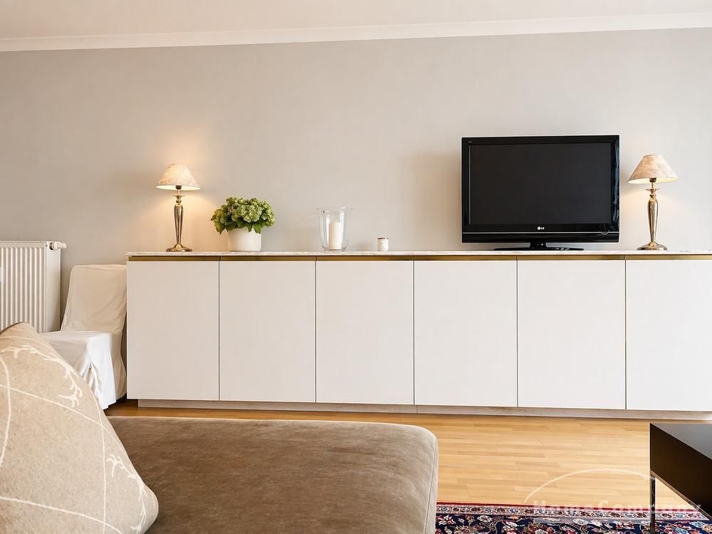 Geschmackvolle Möblierung aus einer Mischung von Antiquitäten und Designer Möbeln. Großzügiges Wohnzimmer mit Ecksofa und Esstisch für 4 Personen, Zugang zum großen Balkon mit Balkonmöbeln. Schlafzimmer mit Himmelbett (1,40 x 2,00 m) und Schrank, zweites Schlafzimmer mit hochwertiger Schlafcouch (1,80 x 2,20 m) und Schrank. Das besondere an der Wohnung sind die beiden Bäder, jeweils angrenzend an die Schlafzimmer. Moderne Einbauküche mit Spülmaschine, Cerankochfeld und Allem für den tägl. Bedarf. Telefon- und Internetflatrate in der Miete enthalten.