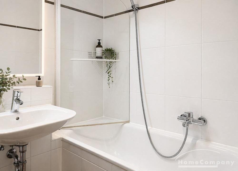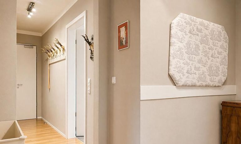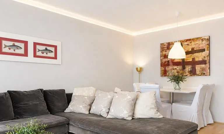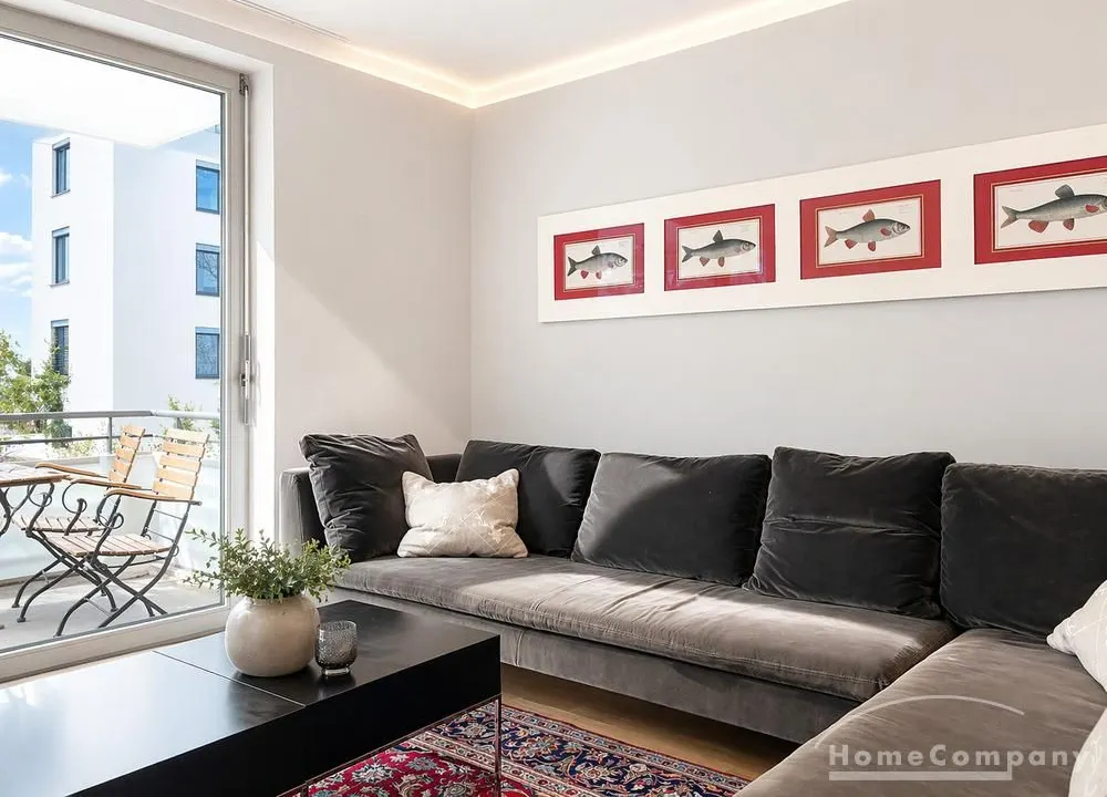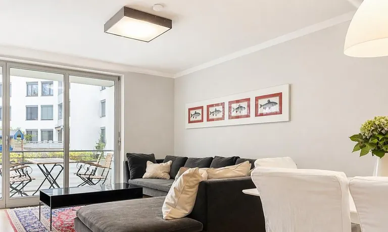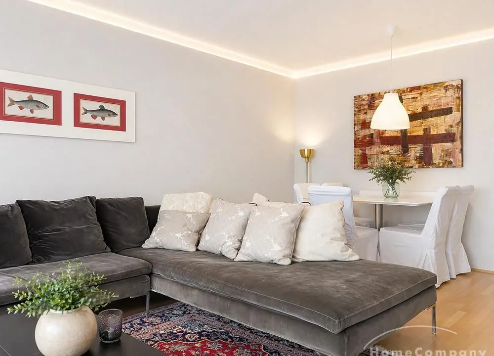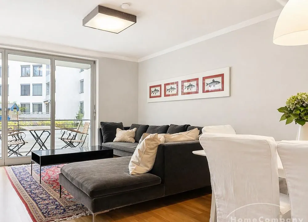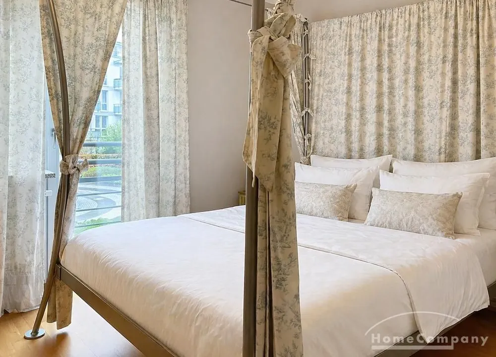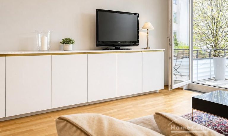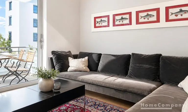 Geschmackvolle Möblierung aus einer Mischung von Antiquitäten und Designer Möbeln. Großzügiges Wohnzimmer mit Ecksofa und Esstisch für 4 Personen, Zugang zum großen Balkon mit Balkonmöbeln. Schlafzimmer mit Himmelbett (1,40 x 2,00 m) und Schrank, zweites Schlafzimmer mit hochwertiger Schlafcouch (1,80 x 2,20 m) und Schrank. Das besondere an der Wohnung sind die beiden Bäder, jeweils angrenzend an die Schlafzimmer. Moderne Einbauküche mit Spülmaschine, Cerankochfeld und Allem für den tägl. Bedarf. Telefon- und Internetflatrate in der Miete enthalten.