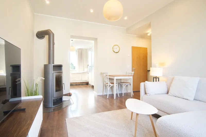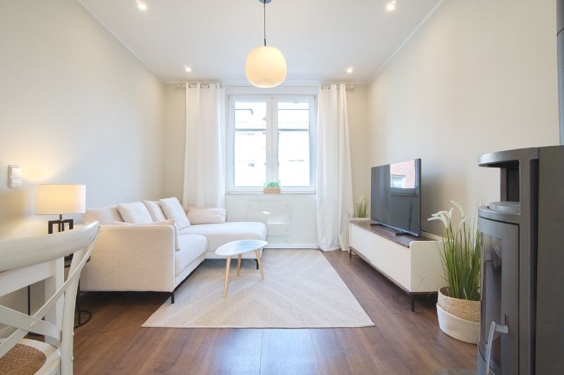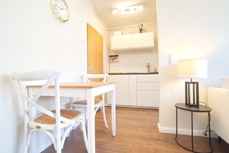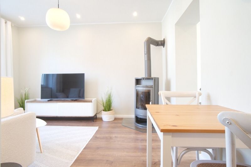 Ansprechend gestaltete Räume mit stimmigem Farbkonzept, hier kann man sich wohlfühlen. Im März 2026 wurden Decken und Wände frisch gestrichen, es gibt eingebaute Deckenstrahler und einen Internetzugang mit 100 Mbit-Vertrag. Der Wohnraum ist mit einer gemütlichen Sofaecke, großem Smart-TV von Philips und einem Kaminofen ausgestattet, der mit Holz befeuert werden kann. Im Essbereich steht ein Tisch mit zwei Stühlen bereit, daneben die Singleküche mit Kühlschrank, Doppelkochfeld und Spüle. Kaffeemaschine, Wasserkocher, Toaster und eine Grundausstattung an Koch- und Essgeschirr sind vorhanden. Das Schlafzimmer ist nach hinten gelegen und mit einem sehr komfortablem Bett mit hochwertiger Matratze, Kleiderschrank und einem kleinen Arbeitsplatz eingerichtet. Das Duschbad ist hell gefliest und hat ein großes Fenster, Rainshower, eine Glastrennwand, Handtuchheizung und ein Kombigerät Waschmaschine mit Trockner. Der Garten hinter dem Haus kann genutzt werden, es gibt Sitzmöglichkeiten.
