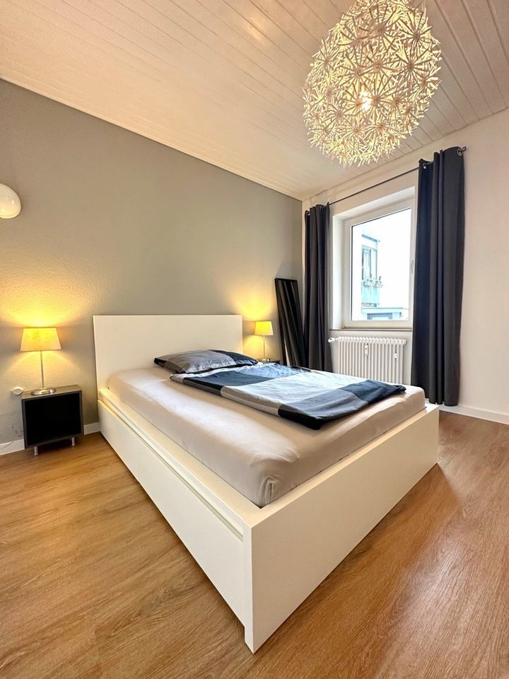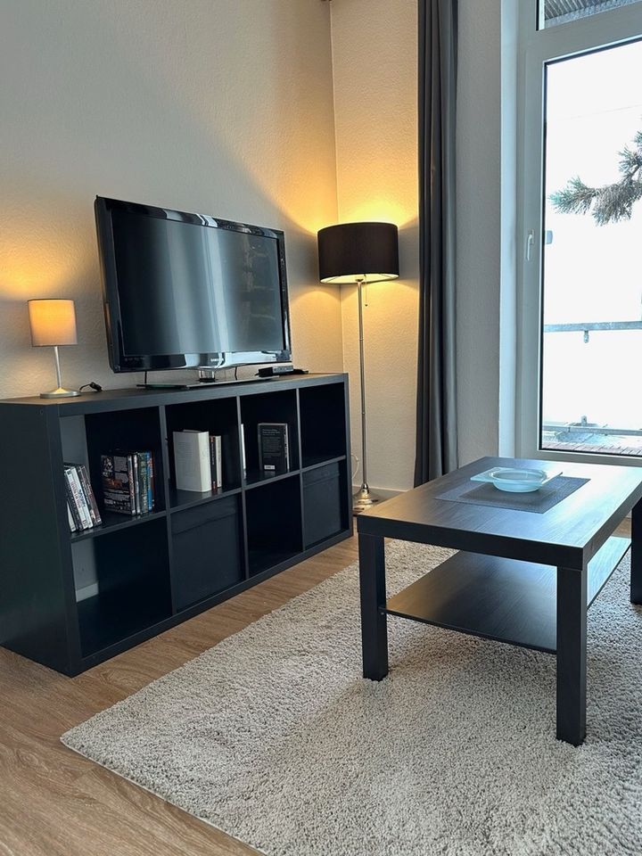 Die Wohnung verfügt über ein Smart-TV und Internetzugang, ab Einzug nutzbar. Waschmaschine und Trockner befinden sich im Waschkeller zur gemeinsamen Nutzung gegen Entgelt. Der Wohnraum ist mit Vinylboden und das Badezimmer mit Fliesen ausgelegt. Die Einbauküche befindet sich in einem separaten Raum und ist zum Wohnraum hin geöffnet. Sie ist mit einem Cerankochfeld und Backofen, mit einem Kühlschrank und Zubehör wie Kaffeemaschine, Wasserkocher, Koch- und Essgeschirr ausgestattet. Im Wohnzimmer befinden sich ein Sofa, Esstisch, Stühle und ein Schreibtisch. Das Bett misst 1,40 x 2,00 Meter und es gibt einen Kleiderschrank und ein Schlafsofa für Besuch, Handtücher und Bettwäsche sind vorhanden.