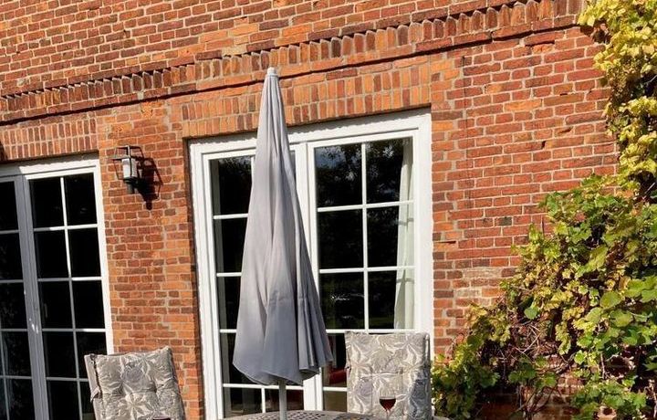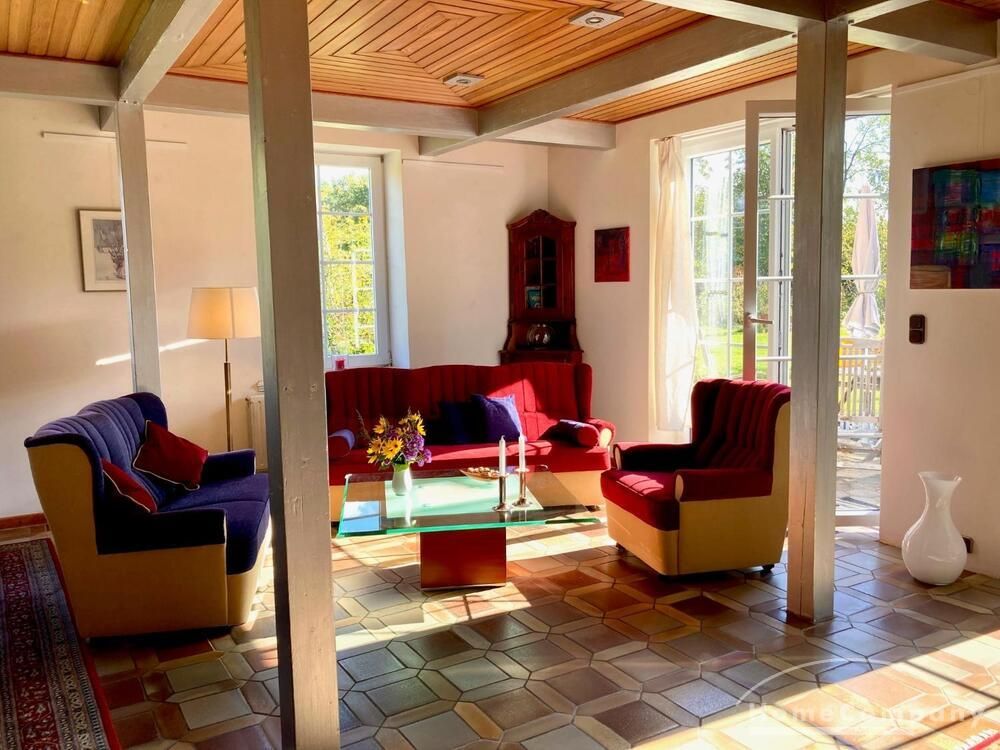 Über die Tür von der Küche betreten Sie dort die mit rd. 27 qm großzügige, helle Sofa-Ecke. Drei Fenster sowie eine große Terrassentür mit Austritt auf die 15qm große Süd-Terrasse bieten den Blick in die ländliche Natur und auf die Pferdewiese.