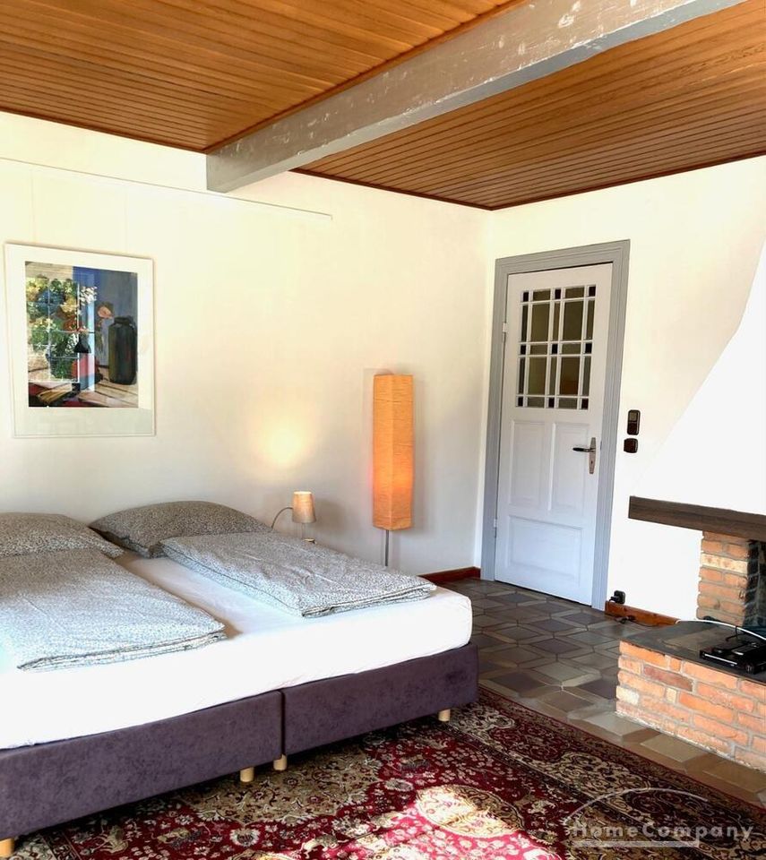 Der an der Tür zur Diele befindliche Teil von rd. 25 qm ist als Schlafzimmer-Bereich mit einem 1,80 m Box-Springbett ausgestattet. Dieses ist auf Wunsch trennbar. Auch hier gibt es eine doppelflügelige Tür mit Zutritt auf die Terrasse.