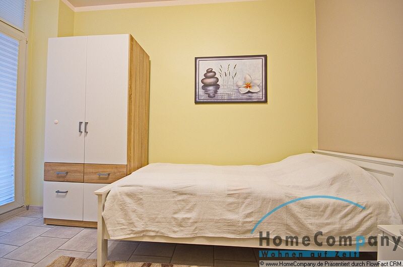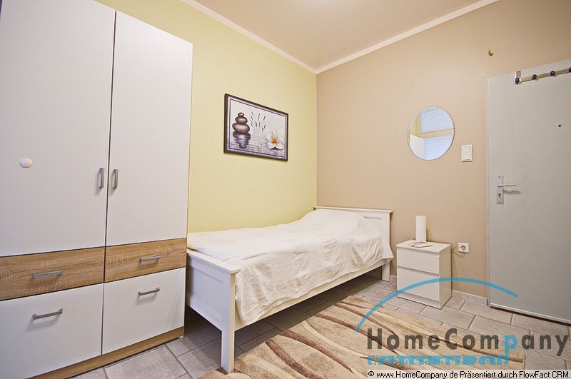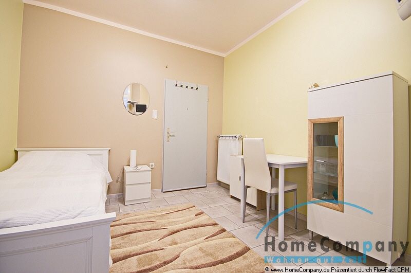 Komplett möbliert, u.a mit Flachbild-Kabel-TV-Gerät, einem Bett, Kleiderschrank, Esstisch, Computertisch und Laminatboden. Das Bett hat die Maße ein mal zwei Meter. Der Reinigungsservice beinhaltet auch Bettwäsche und Handtuchwechsel.