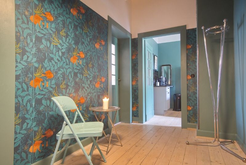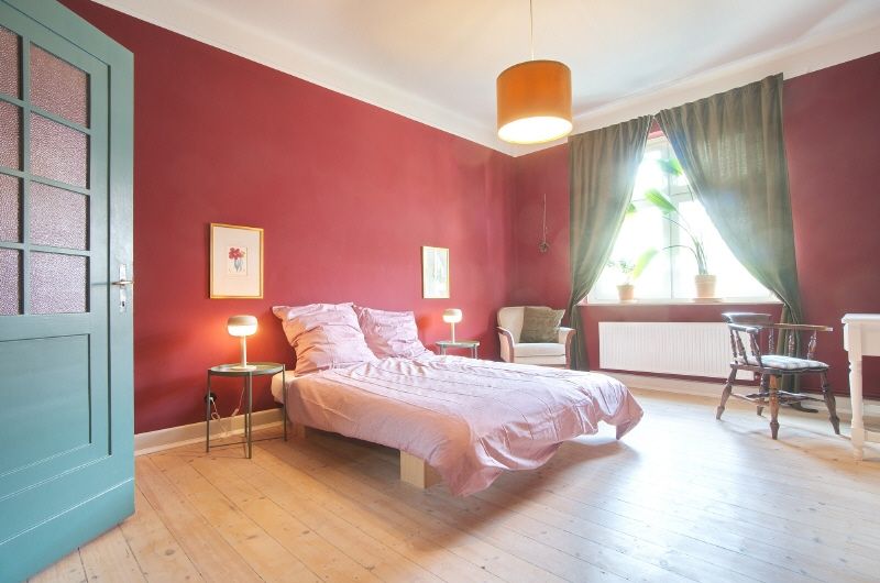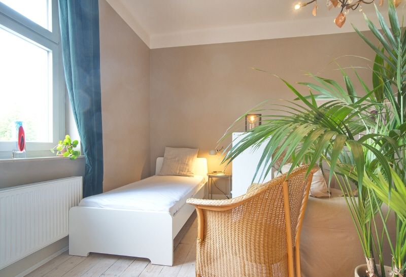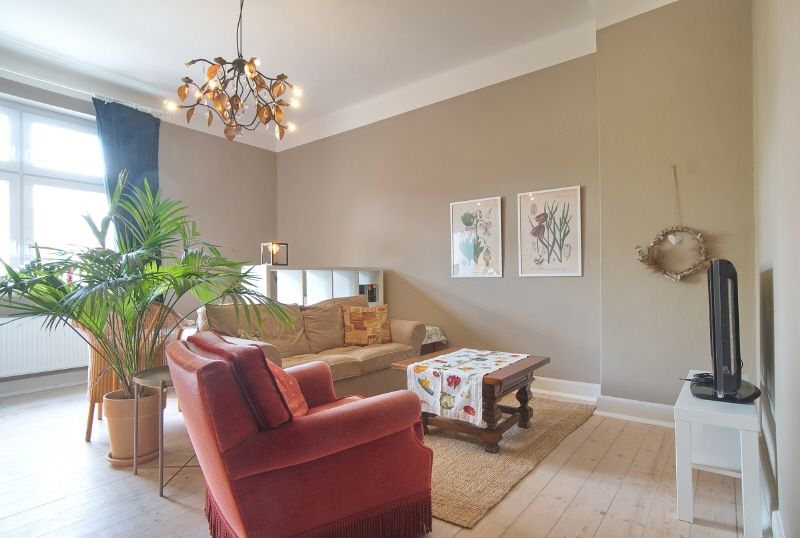 Altbau mit hohen Räumen, Dielenboden, Wände in Feinputz farblich sehr apart gestaltet. Auf dem zum Garten gelegenen Balkon stehen Tisch und Stühle bereit. Die geräumige, zentrale Diele mit Garderobenständer und Sitzgelegenheit bietet Zugang zu allen Räumen. Das Badezimmer ist mit Wanne und Duschvorrichtung inklusive Rainshower, Handtuchheizung und einem Fenster ausgestattet. Im Schlafzimmer stehen ein Doppelbett, Sessel, Kleiderschrank und ein kleiner Schreibplatz bereit. Bettwäsche und Handtücher werden bei Bedarf zur Verfügung gestellt. Das Wohnzimmer ist mit komfortablen Sitzmöbeln (Sofa und Sessel), internetfähigem TV-Gerät sowie einem Regal möbliert, im hinteren Teil des Raums gibt es ein zusätzliches Bett sowie Regal und Kleiderschrank. Ein Highlight ist die zum Garten gelegene Wohnküche mit Esstisch für vier Personen und Zugang zum Balkon. Die Einbauküche beinhaltet einen Backofen auf Körperhöhe, Kochfeld, Kühlschrank sowie Geschirr, Kochutensillien etc. Die Spülmaschine ist in der Kammer untergebracht. Eine Waschmaschine im Keller des Hauses kann genutzt werden.