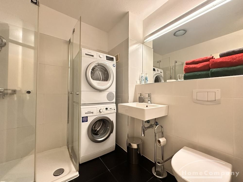 Das Badezimmer ist mit Dusche, Waschbecken, WC und einer Waschmaschine und Wäschetrockner ausgestattet.