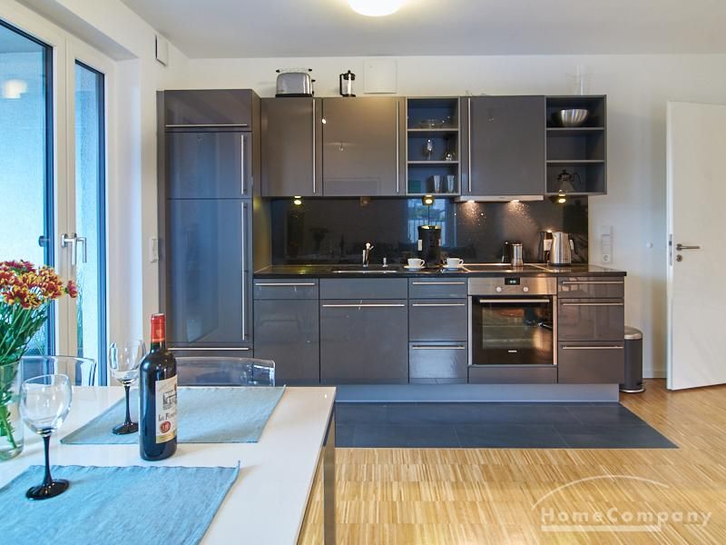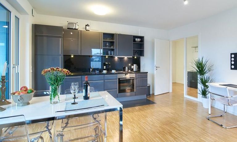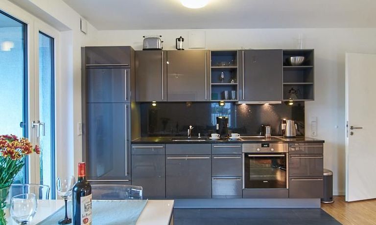 Das Wohnzimmer ist mit einem bequemen Sofabereich, einem Esstisch für bis zu vier Personen, einem 1,40er TV und einem kleinen Arbeitsbereich ausgestattet. Die offene Küche ist in einem modernen Anthrazitton gehalten.