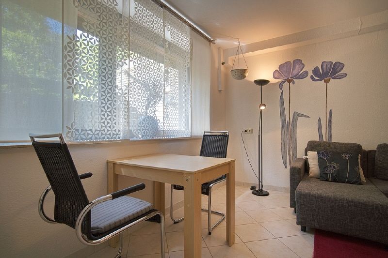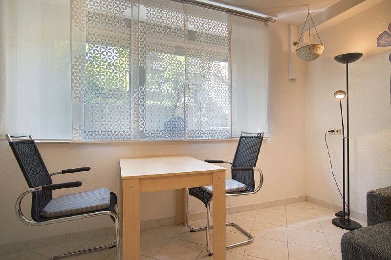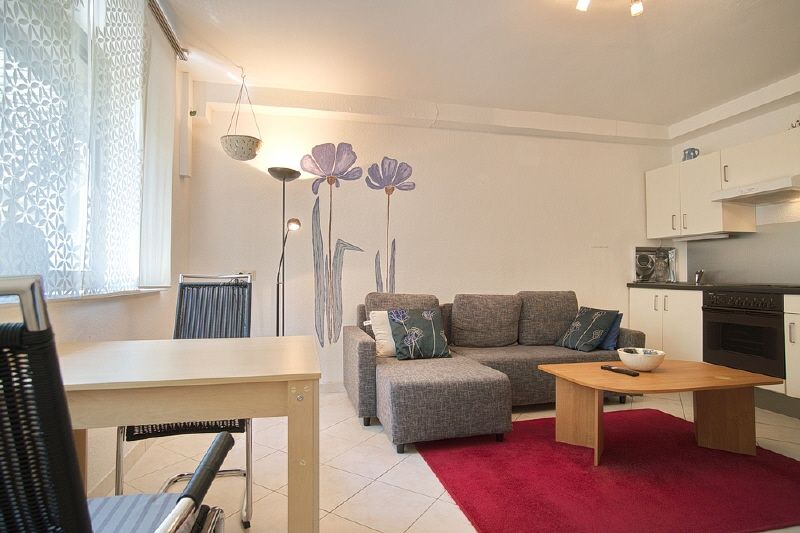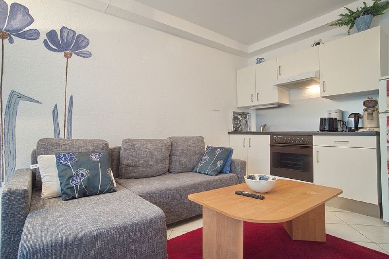 Vollständige Ausstattung inklusive Kücheninventar, Bettzeug, Bettwäsche und Handtücher. Internetzugang über W-LAN. Wohnraum mit Fliesenboden, Sofaecke (Schlaffunktion), TV-Gerät (Smart-TV), Esstisch mit zwei Stühlen. Die Einbauküchenzeile ist offen in den Wohnraum integriert und mit großem Kühlschrank, Gefrierfach, Kochfeld mit Dunstabzugshaube, Backofen mit Microwelle, Kaffeemaschine, Wasserkocher, Geschirr etc. komplett ausgestattet. Zwischendiele mit Kleiderschrank, hell gefliestes Duschbad mit Glaskabine, Waschtisch mit Schränken (viel Stauraum), eingebaute Deckenstrahler. Das Schlafzimmer ist mit einem teilbaren Doppelbett und Nachtkästchen möbliert. Diele mit Garderobe, ein Abstellraum steht z.B. für Koffer zur Verfügung.
