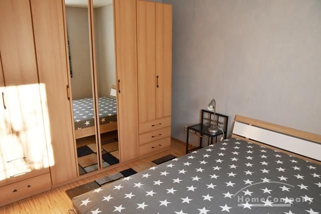 Schlafzimmer mit Bett 140×200 cm, Kleiderschrank.