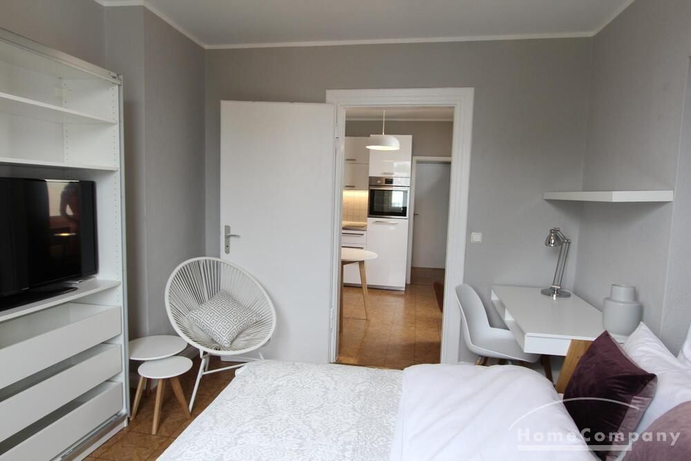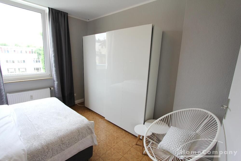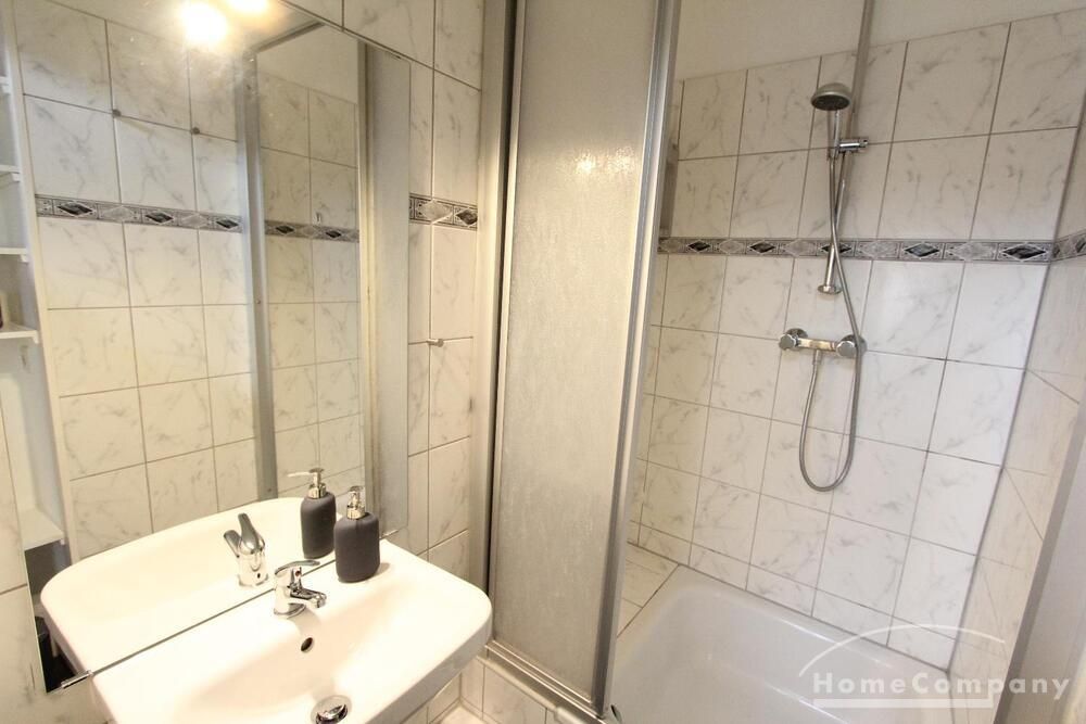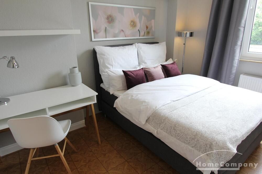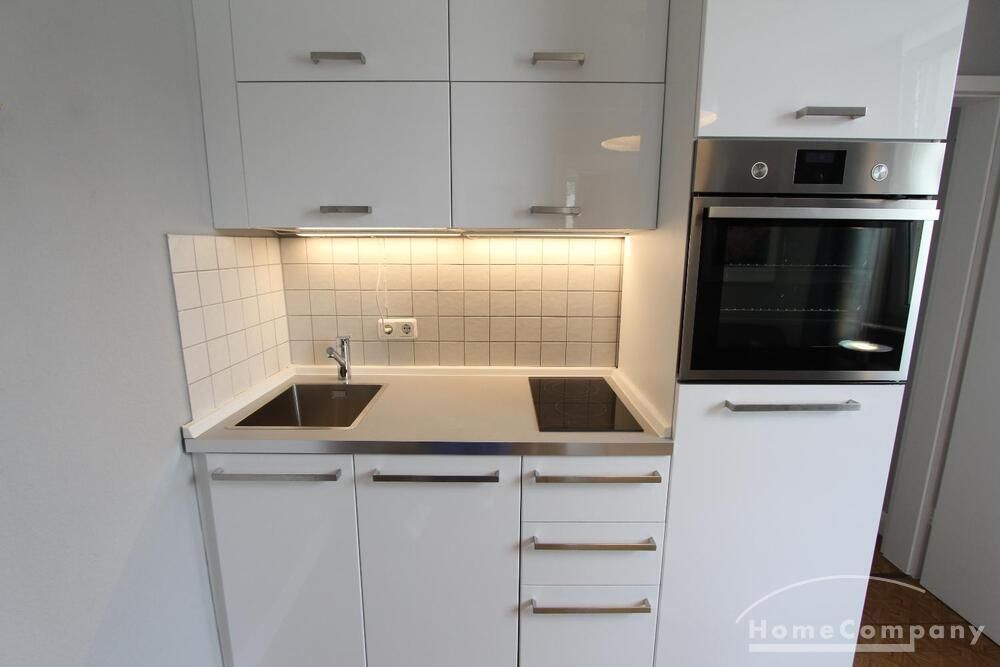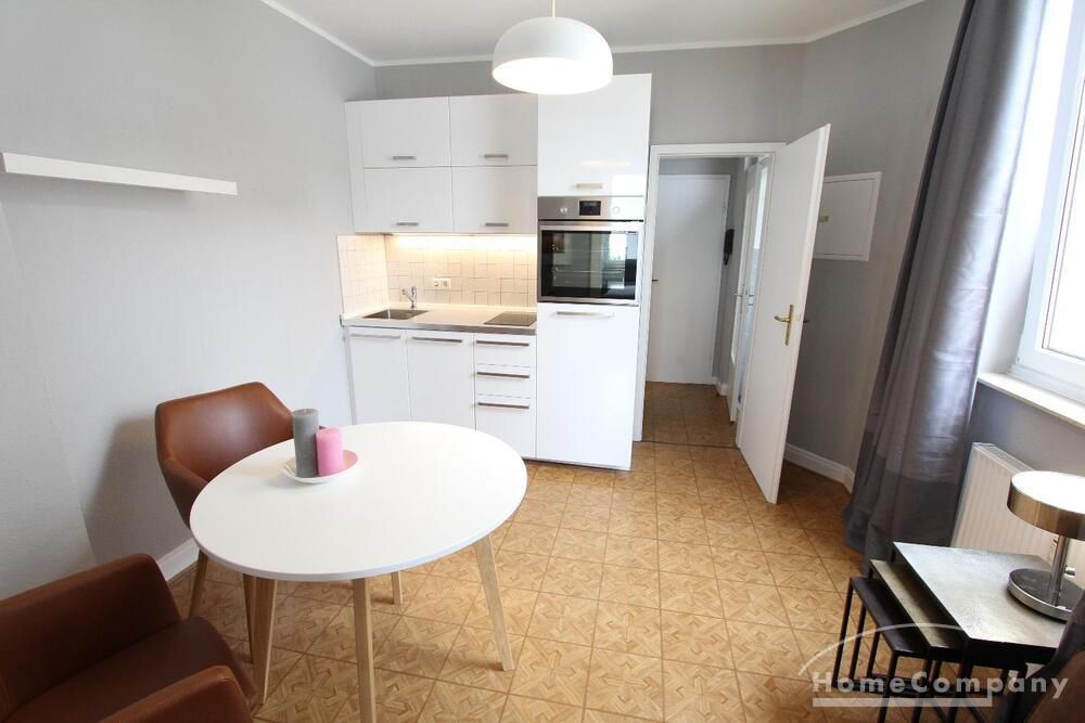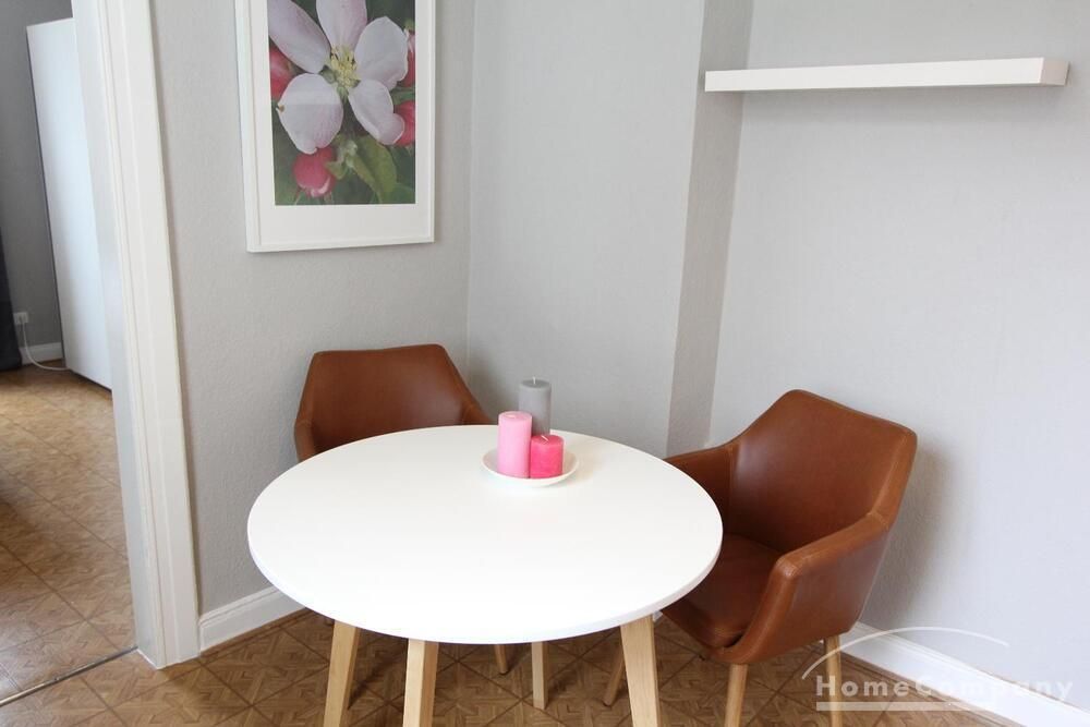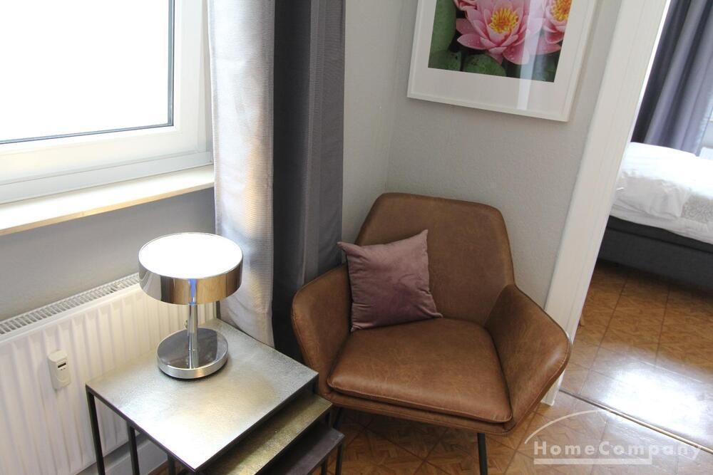 Absolut stylische 2-Zimmer-Wohnung mit einem großen, hellen Schlafzimmer (großer Kleiderschrank, Schreibtisch und Flachbildfernseher), Badezimmer mit Dusche, einem separaten WC und einem Wohnbereich (Leder-Sessel, Esstisch) mit offener Pantryküche, die mit allen nützlichen Geräten ausgestattet ist.