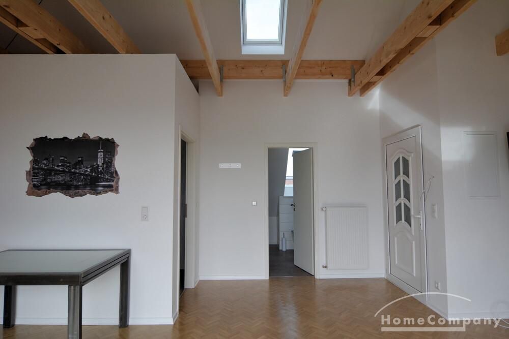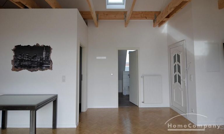 Die Wohnung besteht aus einem großem Wohnberereich mit modernen Möbeln, einer offenen Einbauküche inklusive Geschirrspüler, einem gefliestem Duschbad sowie einem Schlafzimmer mit eingebautem Bett incl. Stauraum und Schränken. Schöne helle Räume (Raumhöhe 4,50m) mit tollem Ausblick und massivem Echtholzparkett. Die Wohnung ist hell und freundlich eingerichtet.