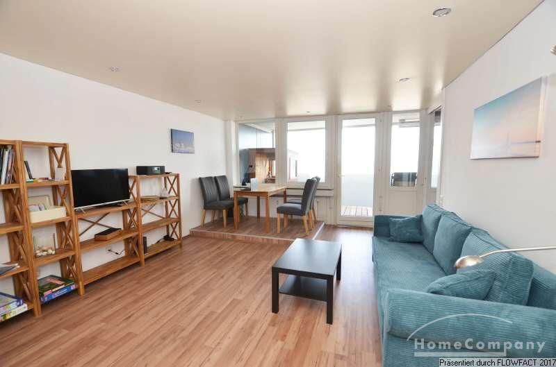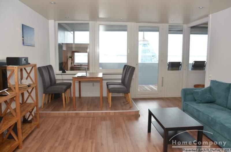 Die Wohnung liegt in der 6. Etage einer größeren Wohneinheit im Herzen Bremerhavens. Die Loggia ist zur Wasserseite ausgerichtet und ermöglicht einen fantastischen Ausblick auf die Havenwelten und die Weser. Am Abend kann man von hieraus auch den beeindruckenden Sonnenuntergang genießen. Vom kleinen Flur gelangt man in den Wohnraum mit der vorgelagerten großen Loggia. Das Wohnzimmer besteht aus einem Essbereich und einer gemütlichen Sitzecke zum Entspannen. Die moderne Küche liegt offen zum Wohnzimmer und voll ausgestattet. Das Schlafzimmer ist mit einem Doppelbett und einem großzügigen Kleiderschrank ausgestattet. Auch hier kann man den einmaligen Ausblick genießen Durch eine Schiebtür kann man das Zimmer zum Wohnraum öffnen. Ein Schwimmbad, Sauna und ein kleiner Fitnessraum stehen im 25. OG. zur Mitbenutzung zur Verfügung.