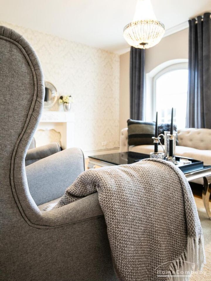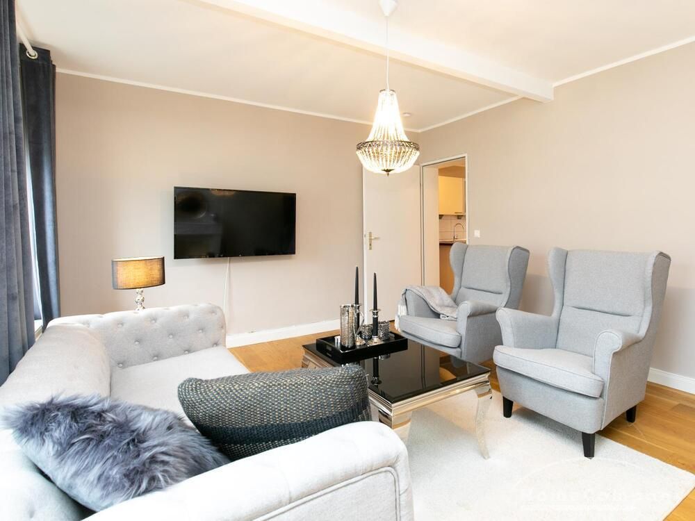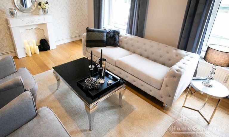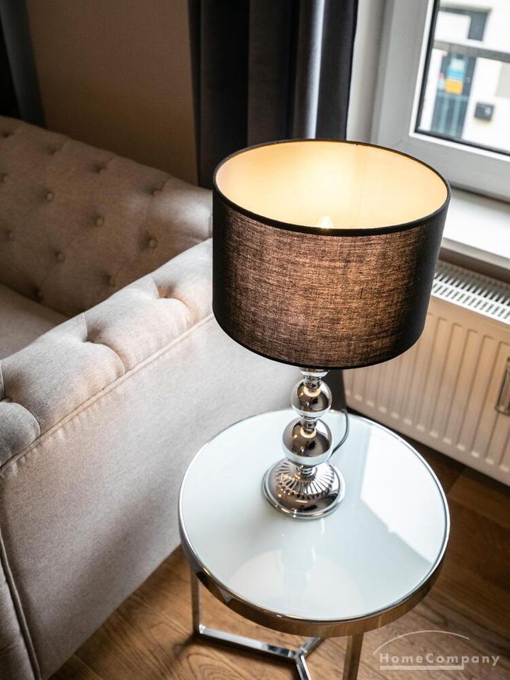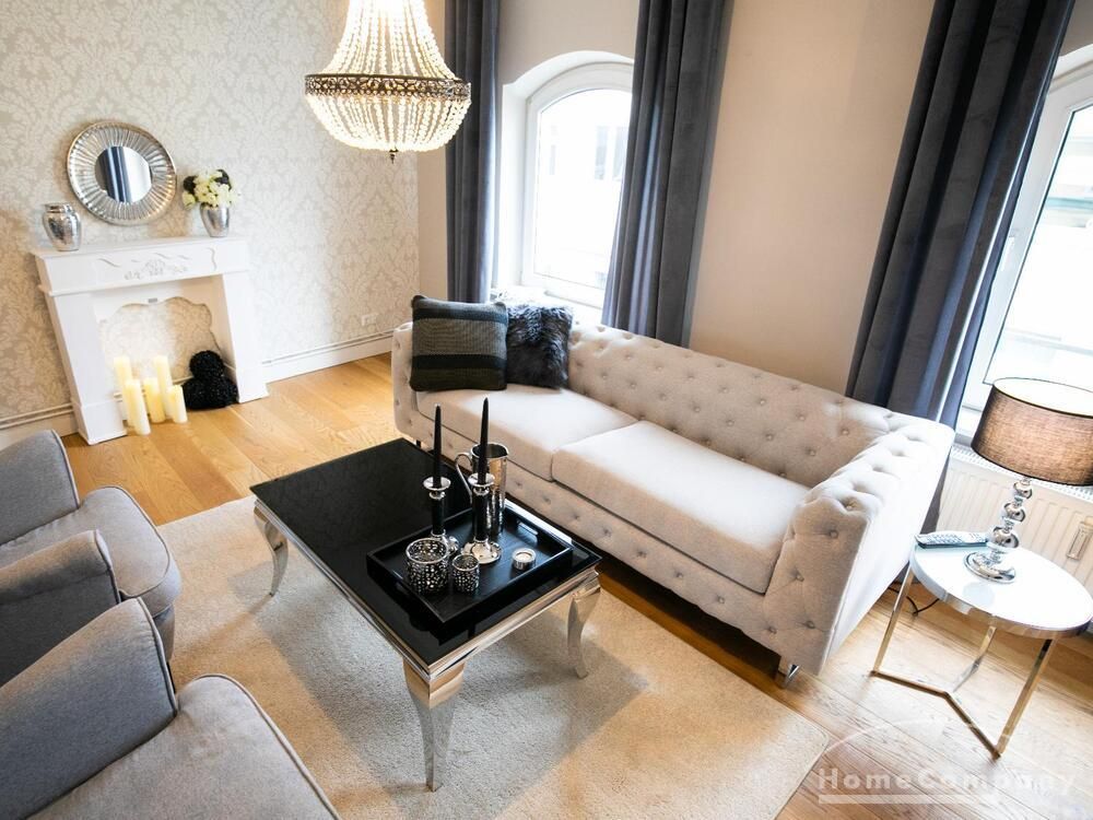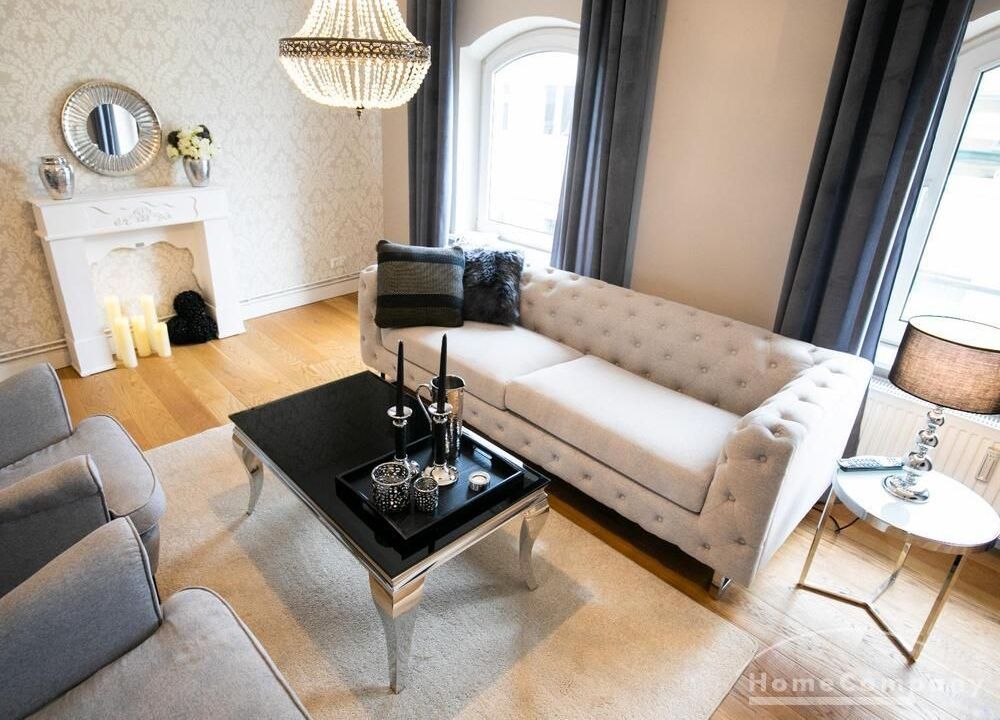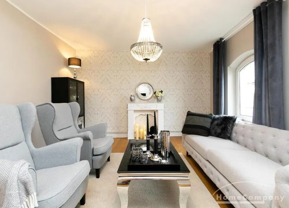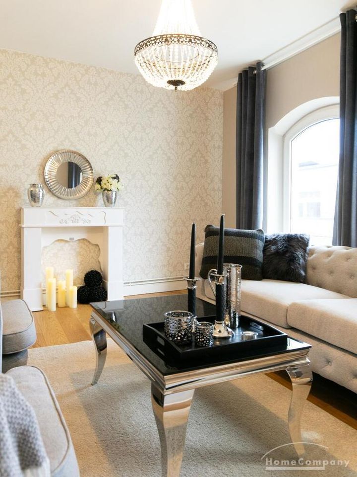Ende 2020 komplett renovierte und neu ausgestattete Wohnung im Townhouse Chic. Die harmonische Farb- und Möblierungsgestaltung in Beige, Grau und Schwarz geben dieser Businesswohnung ein zeitloses Ambiente. Die Tapete mit modernen Barockmuster, zwei gemütliche hellgrau-moderne Ohrensessel, ein Kaminsims, der moderne Metall-Hochschrank, ein 48-Zoll-Fernseher und der Kronleuchter rücken das beige 3er-Sofa im Chesterfield Style und den einzigartigen Couchtisch mit schwarzer Glasplatte und hochwertigen Accessoires in Szene und verleihen dem Wohnzimmer eine glamouröse Ausstrahlung.