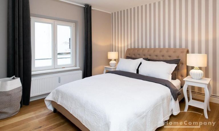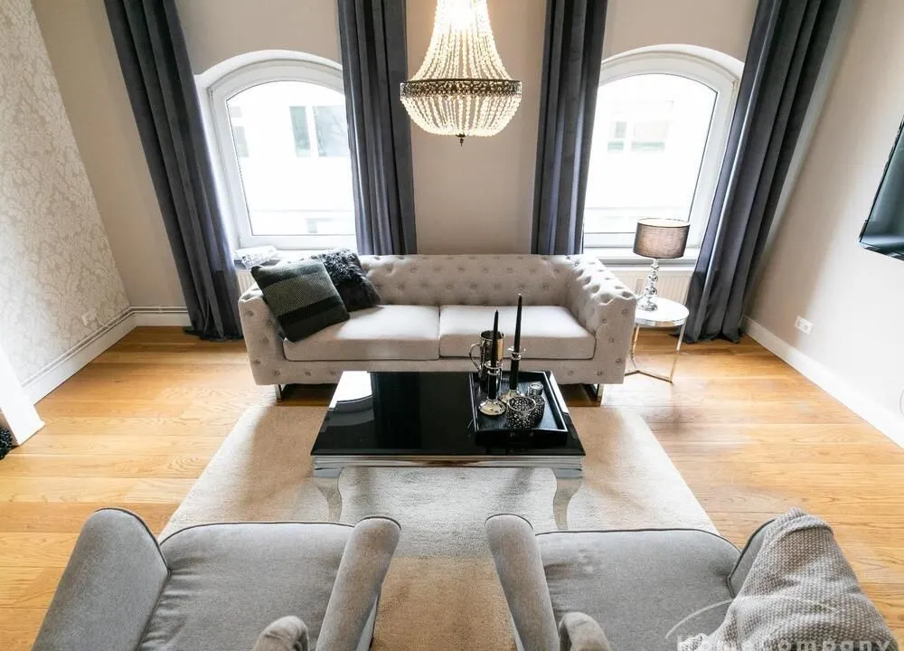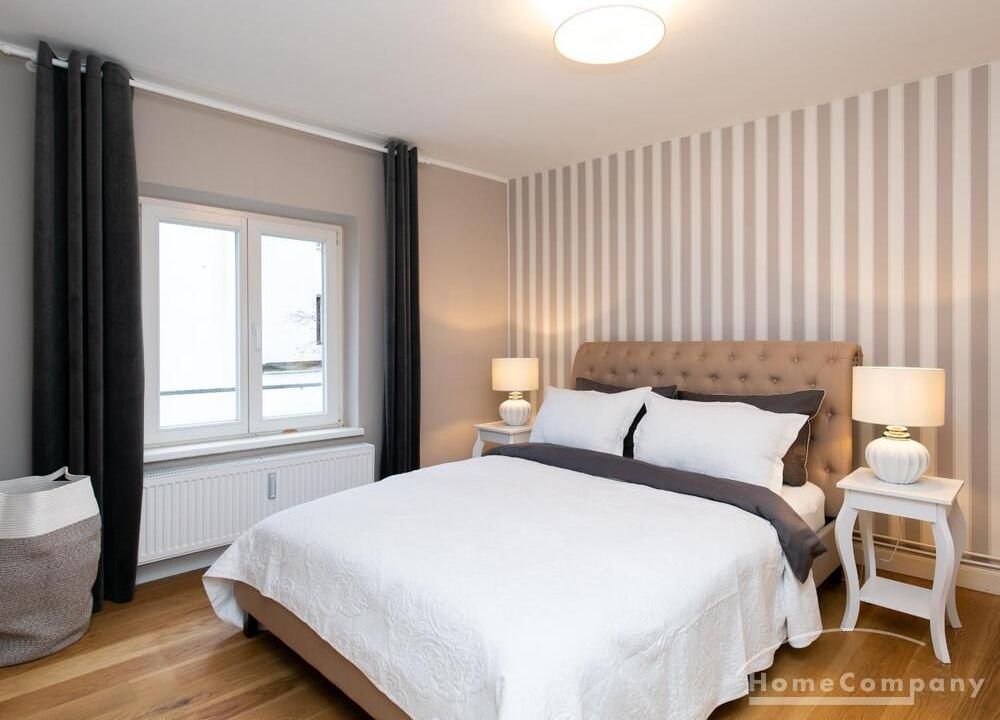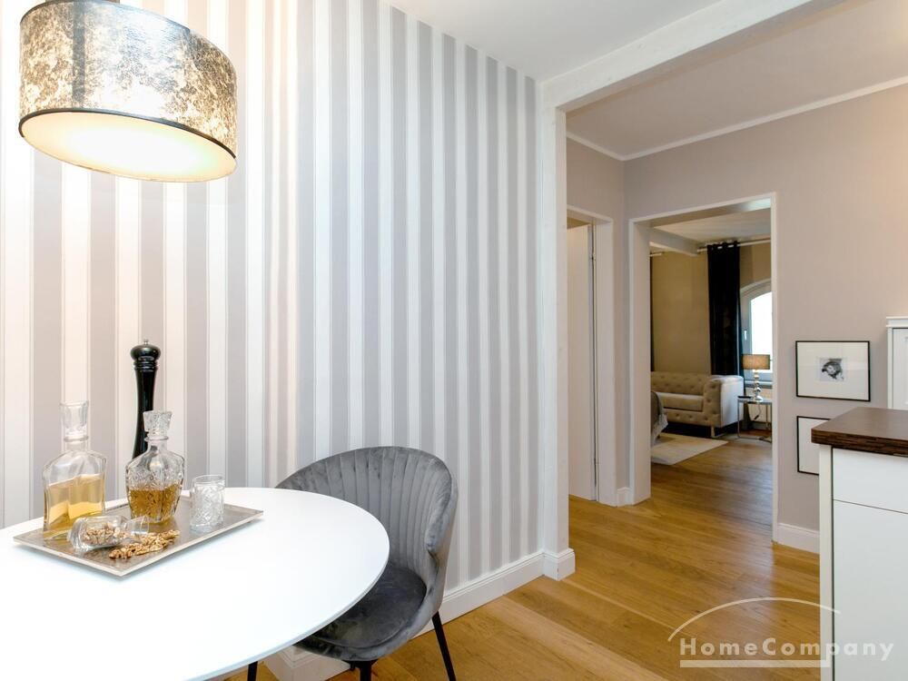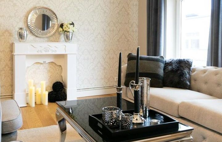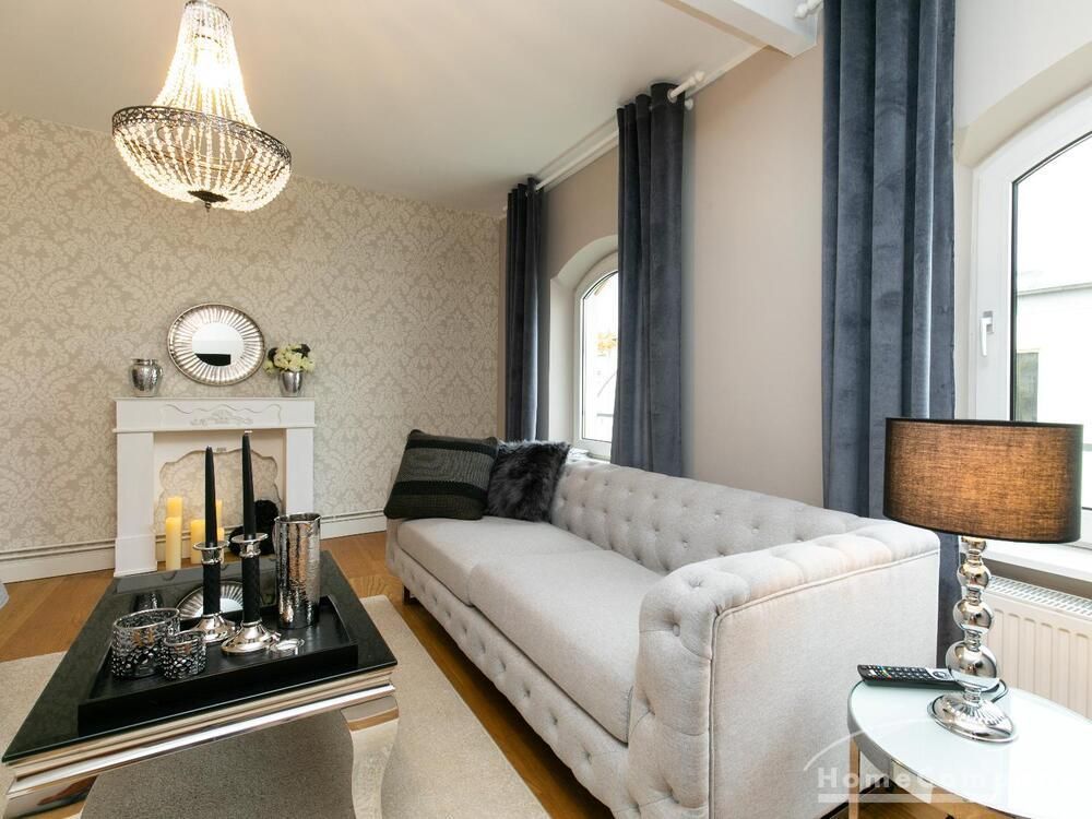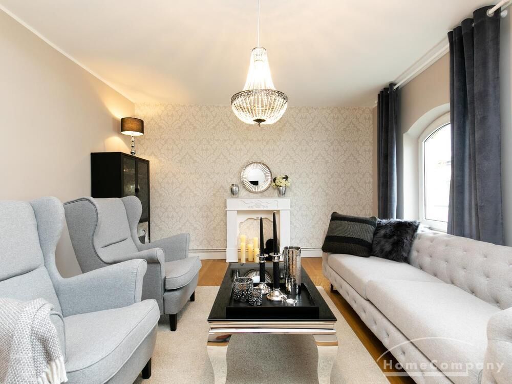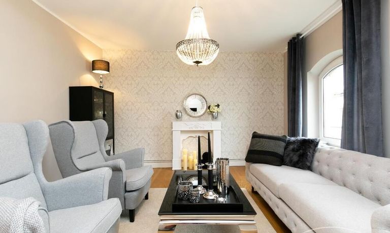 Ende 2020 komplett renovierte und neu ausgestattete Wohnung im Townhouse Chic. Die harmonische Farb- und Möblierungsgestaltung in Beige, Grau und Schwarz geben dieser Businesswohnung ein zeitloses Ambiente. Die Tapete mit modernen Barockmuster, zwei gemütliche hellgrau-moderne Ohrensessel, ein Kaminsims, der moderne Metall-Hochschrank, ein 48-Zoll-Fernseher und der Kronleuchter rücken das beige 3er-Sofa im Chesterfield Style und den einzigartigen Couchtisch mit schwarzer Glasplatte und hochwertigen Accessoires in Szene und verleihen dem Wohnzimmer eine glamouröse Ausstrahlung.
