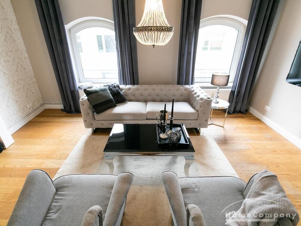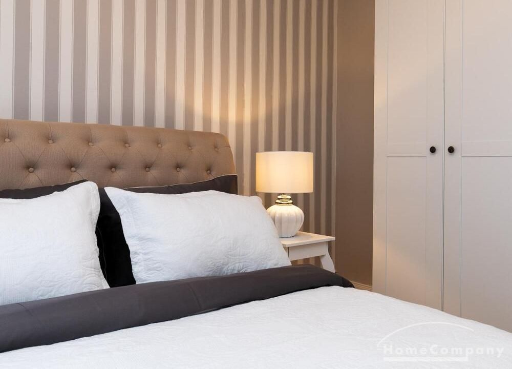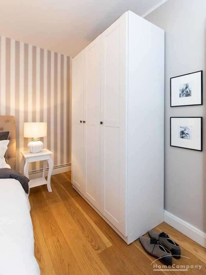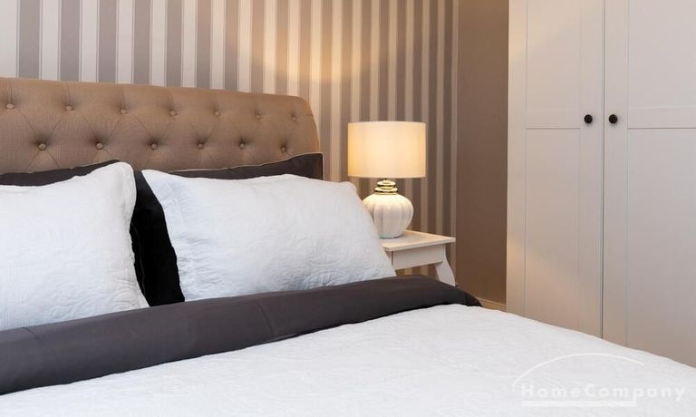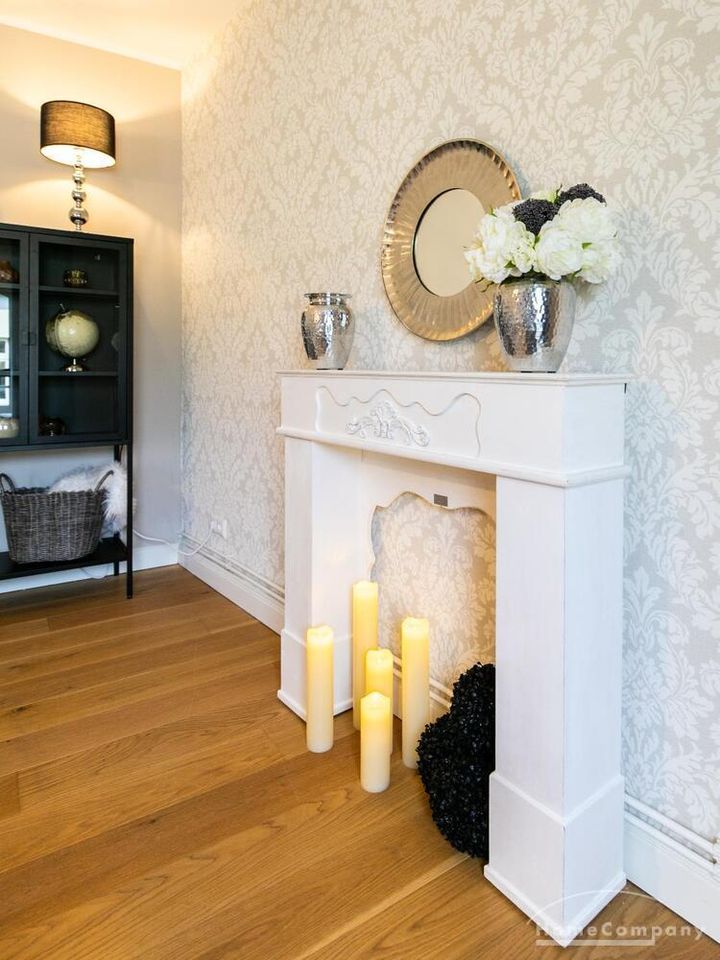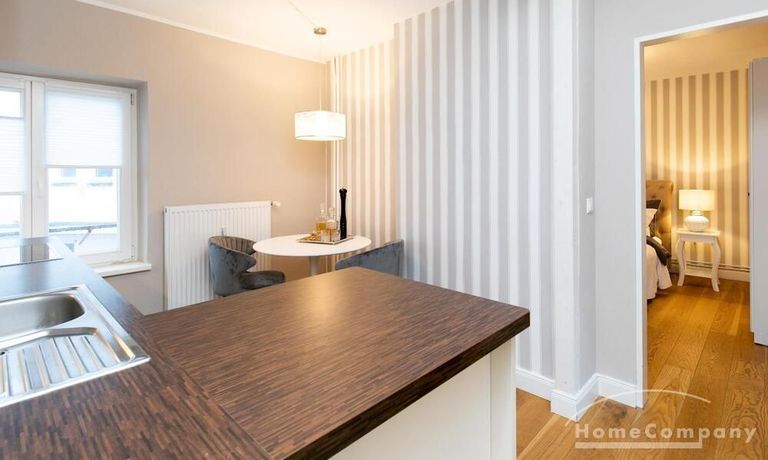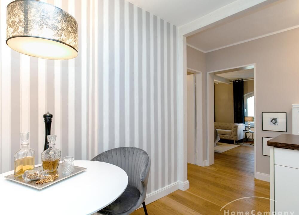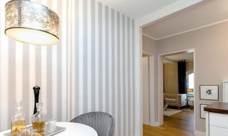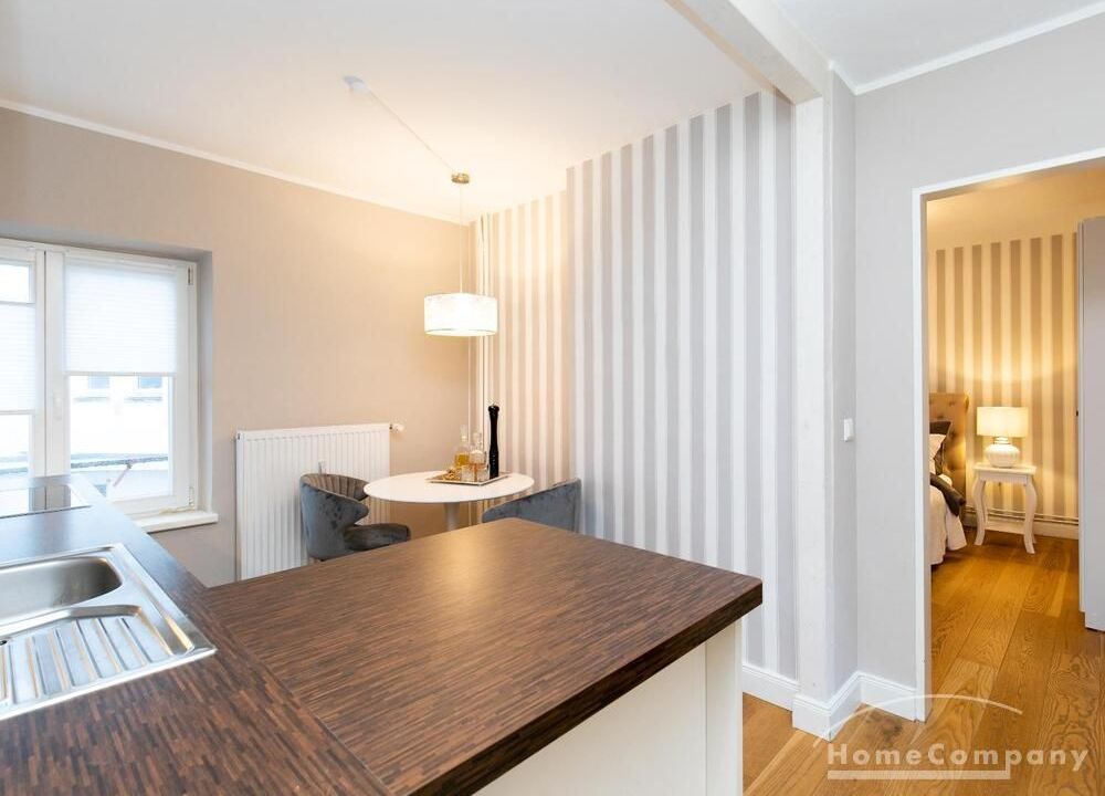 Ende 2020 komplett renovierte und neu ausgestattete Wohnung im Townhouse Chic. Die harmonische Farb- und Möblierungsgestaltung in Beige, Grau und Schwarz geben dieser Businesswohnung ein zeitloses Ambiente. Die Tapete mit modernen Barockmuster, zwei gemütliche hellgrau-moderne Ohrensessel, ein Kaminsims, der moderne Metall-Hochschrank, ein 48-Zoll-Fernseher und der Kronleuchter rücken das beige 3er-Sofa im Chesterfield Style und den einzigartigen Couchtisch mit schwarzer Glasplatte und hochwertigen Accessoires in Szene und verleihen dem Wohnzimmer eine glamouröse Ausstrahlung.