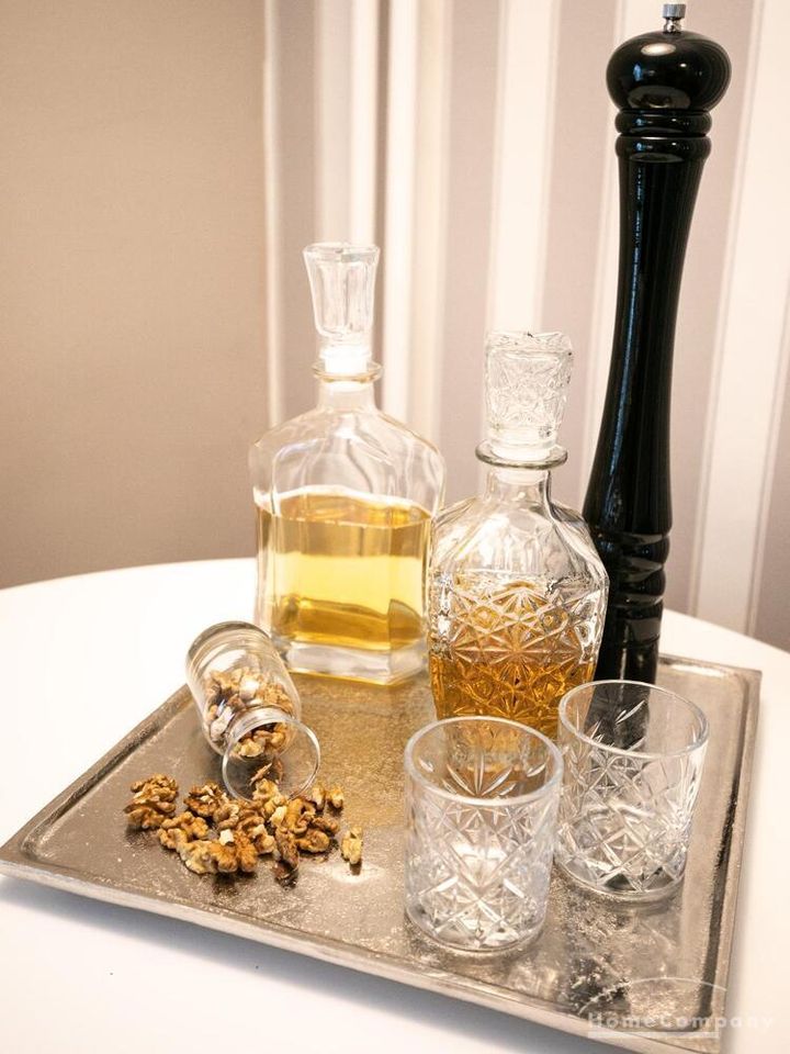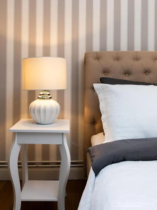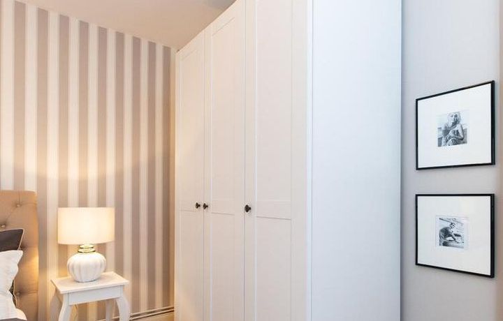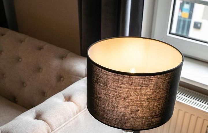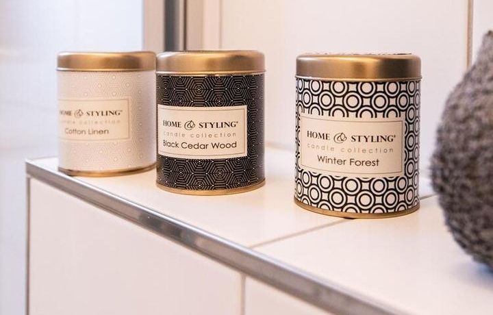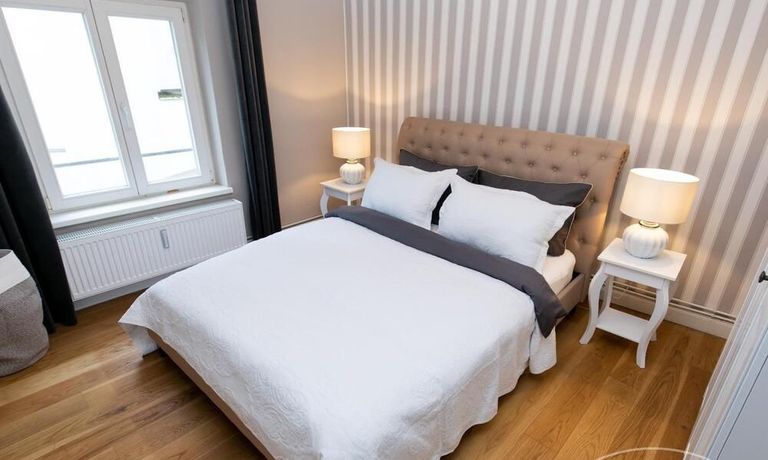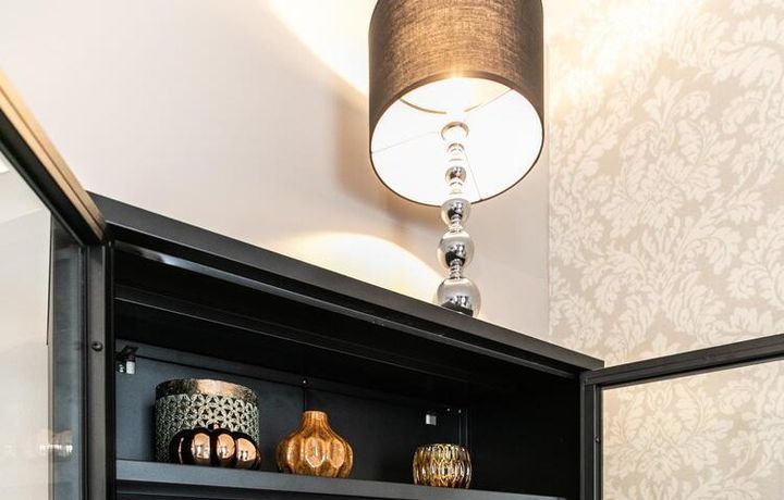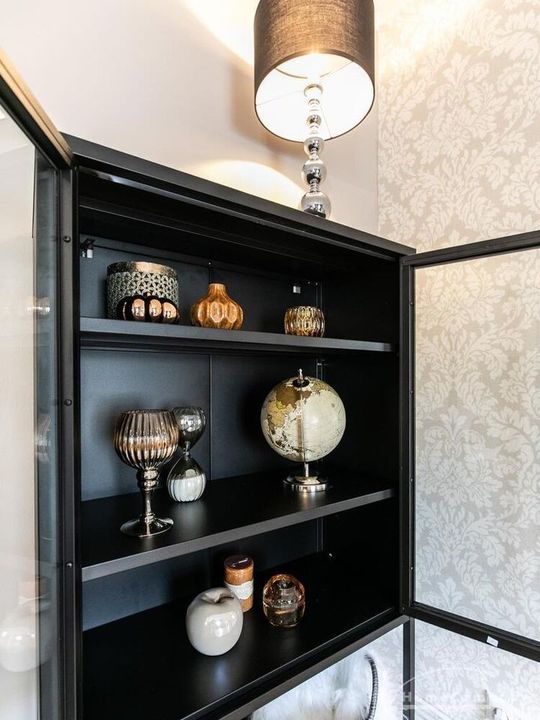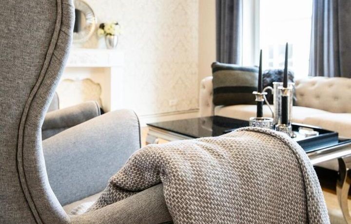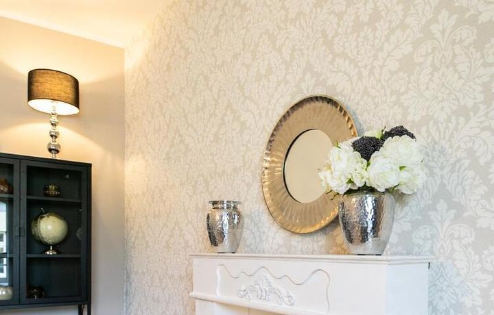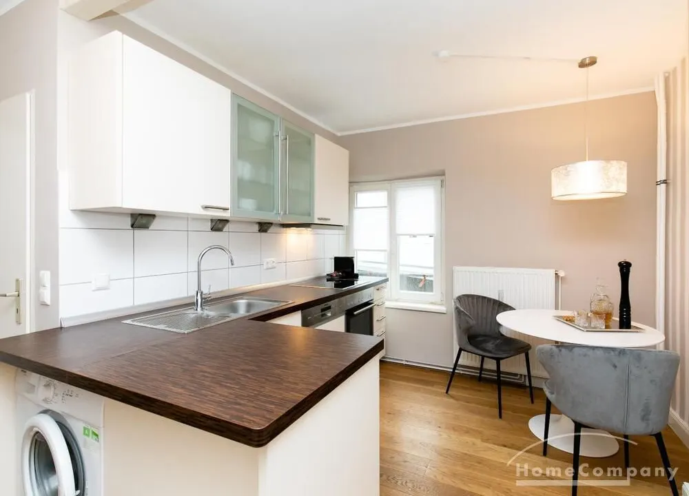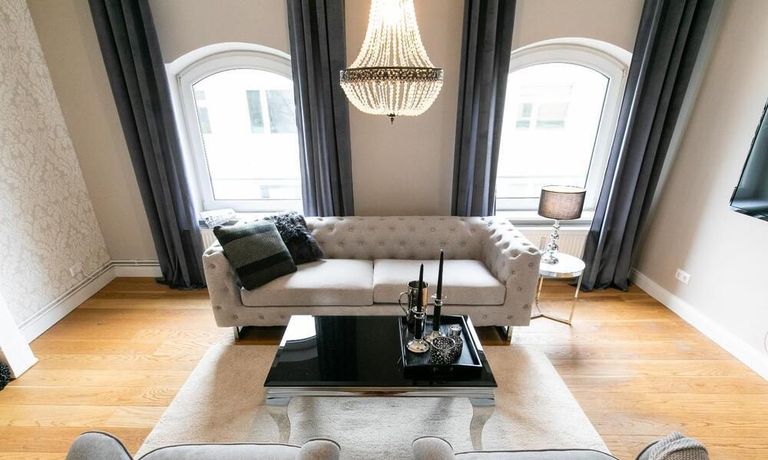 Ende 2020 komplett renovierte und neu ausgestattete Wohnung im Townhouse Chic. Die harmonische Farb- und Möblierungsgestaltung in Beige, Grau und Schwarz geben dieser Businesswohnung ein zeitloses Ambiente. Die Tapete mit modernen Barockmuster, zwei gemütliche hellgrau-moderne Ohrensessel, ein Kaminsims, der moderne Metall-Hochschrank, ein 48-Zoll-Fernseher und der Kronleuchter rücken das beige 3er-Sofa im Chesterfield Style und den einzigartigen Couchtisch mit schwarzer Glasplatte und hochwertigen Accessoires in Szene und verleihen dem Wohnzimmer eine glamouröse Ausstrahlung.