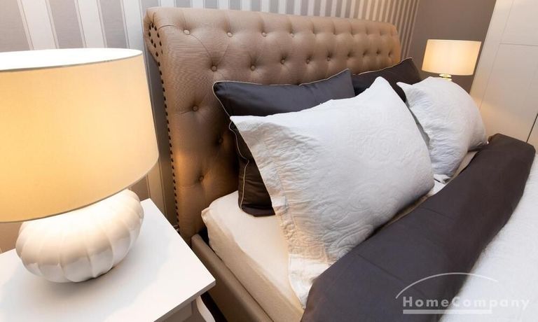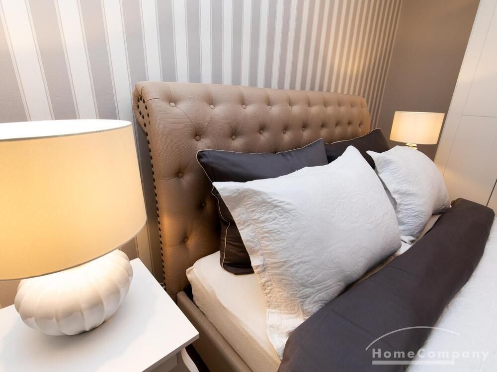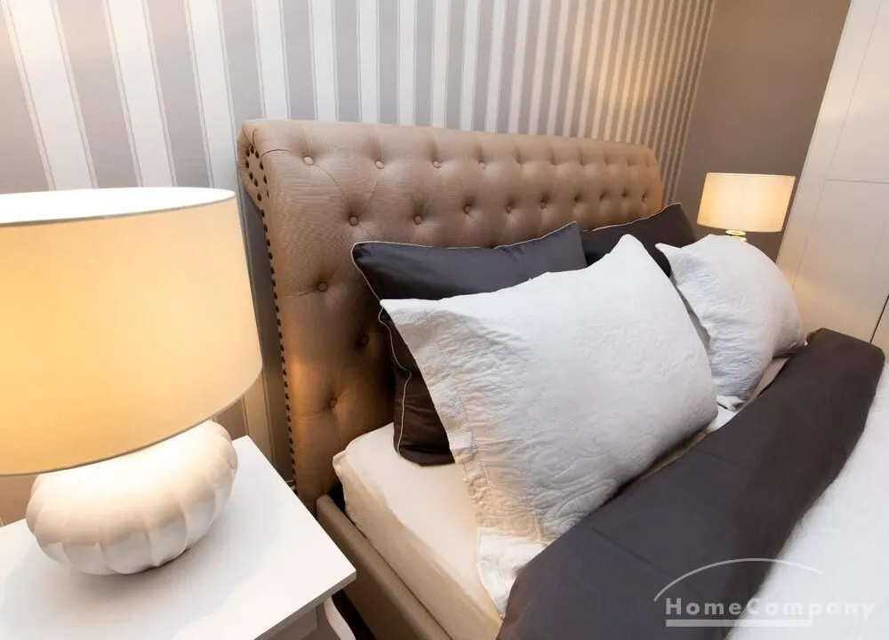 Die offen gestaltete Küche hat einen kleinen, gemütlichen Essbereich. Das ruhige, zum Innenhof gelegene Schlafzimmer ist mit einem 1,60 breiten eleganten Polsterbett in edlem Beige in Leinenoptik eine wahre Wohlfühloase und bietet optimalen Liegekomfort. Das knapp 90 cm hohe Kopfteil ist bequem gepolstert, am oberen Rand wunderschön abgerundet und verfügt neben den klassischen Steppnähten mit Knopfverzierung auch über eine dekorative Verzierung mit Metallnieten am äußeren Rand.