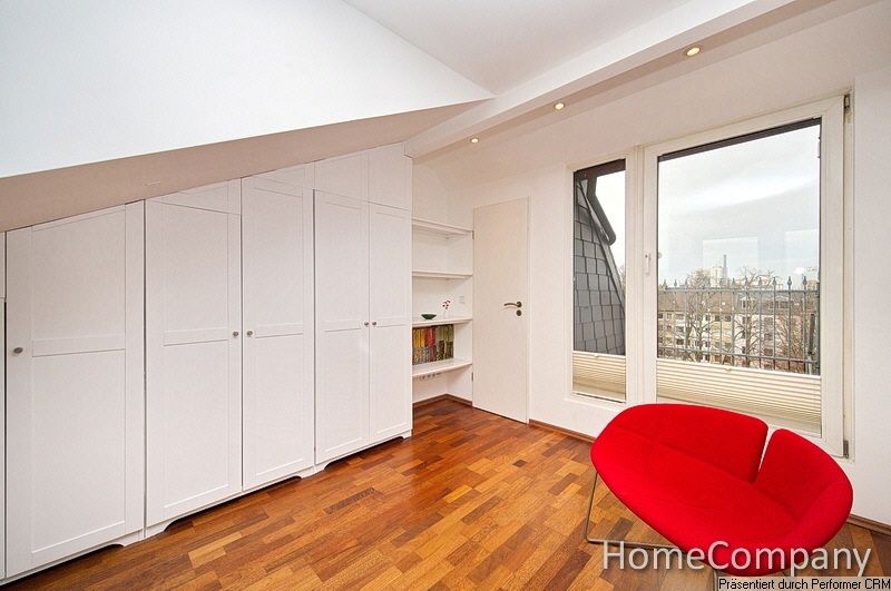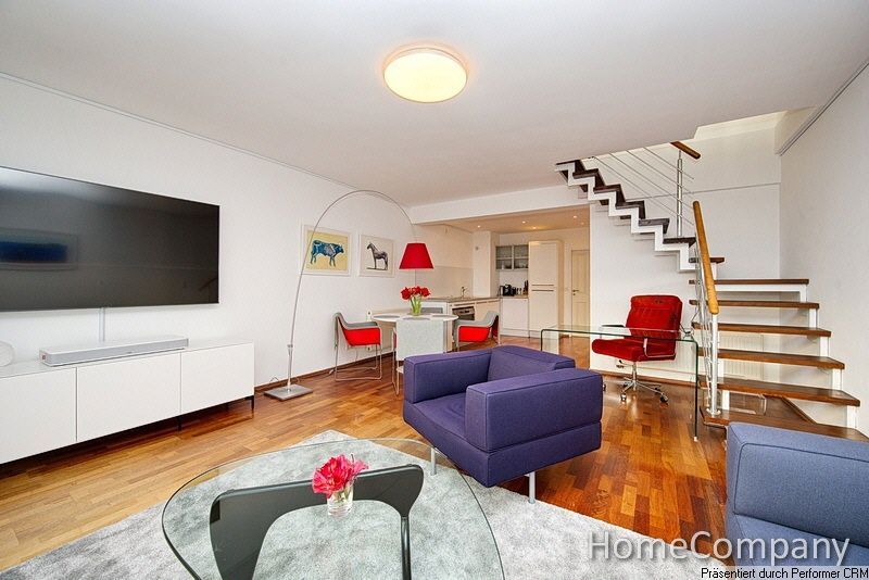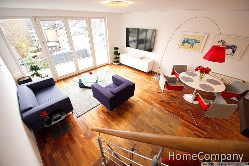 Ein Traum mitten in der Stadt! Mit dem privaten Aufzug gelangen Sie bequem und sicher auf die 5. Etage in Ihre Wohnung, Die Wohnung bietet auf zwei Ebenen alles um Ihren Aufenthalt in Düsseldorf unvergesslich werden zu lassen. Im 5. OG gelangen Sie in den großzügig geschnittenen Wohnbereich mit französischem Balkon. Ausgestattet mit feinsten Designermöbeln haben Sie eine gemütliche Sitzecke mit Sofa und einem Sessel, das Smart-TV inklusive, Teufel-Soundbar und Highspeed-Internetzugang. Der Esstisch bietet Platz für vier Personen. Die offene Einbauküche genügt höchsten Ansprüchen, alle Geräte wie Kochzone, Backofen, Spülmaschine sind von Gaggenau, die große Kühl-Gefrier-Kombination ist von Liebherr. Das anschließende Bad bietet Ihnen eine große Eckbadewanne mit Duschvorrichtung, Waschtisch und Hänge-WC. In einer Nische ist eine Waschmaschine mit integrierter Trocknerfunktion installiert. Unter der Treppe zum Schlafbereich im Dachgeschoss ist der HomeOffice Schreibtisch mit einem bequemen Bürosessel platziert. Der Schlafbereich im oberen Geschoss ist mit einem Doppelbett (160 x 200 cm) und einem sehr geräumigen Einbauschrank für Ihre persönliche Kleidung und Wäsche eingerichtet. Vom Schlafzimmer gelangen Sie auf den Dachbalkon mit herrlichem Blick über die Dächer Richtung Medienhafen und Innenstadt. Das separate WC der Marke Villeroy& Boch viClean-U rundet die perfekte Ausstattung auf diese Etage ab.