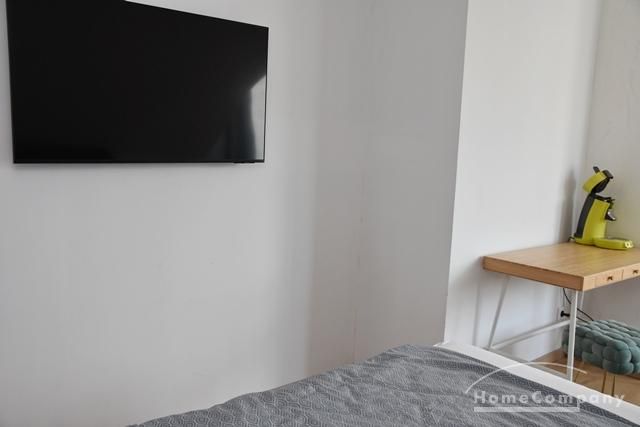 Wohnraum mit Boxspringbett 160×220 cm, kleiner Tisch mit Stuhl, Smart-TV, Schreibtisch mit Stuhl,