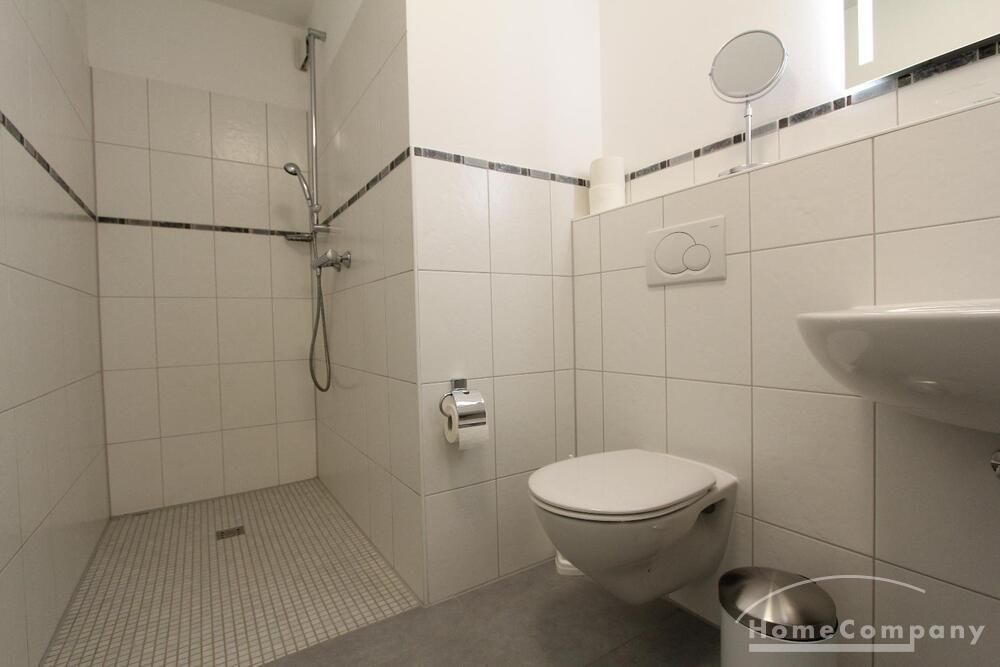 – weiß gefliestes Badezimmer mit bodentiefer Dusche.