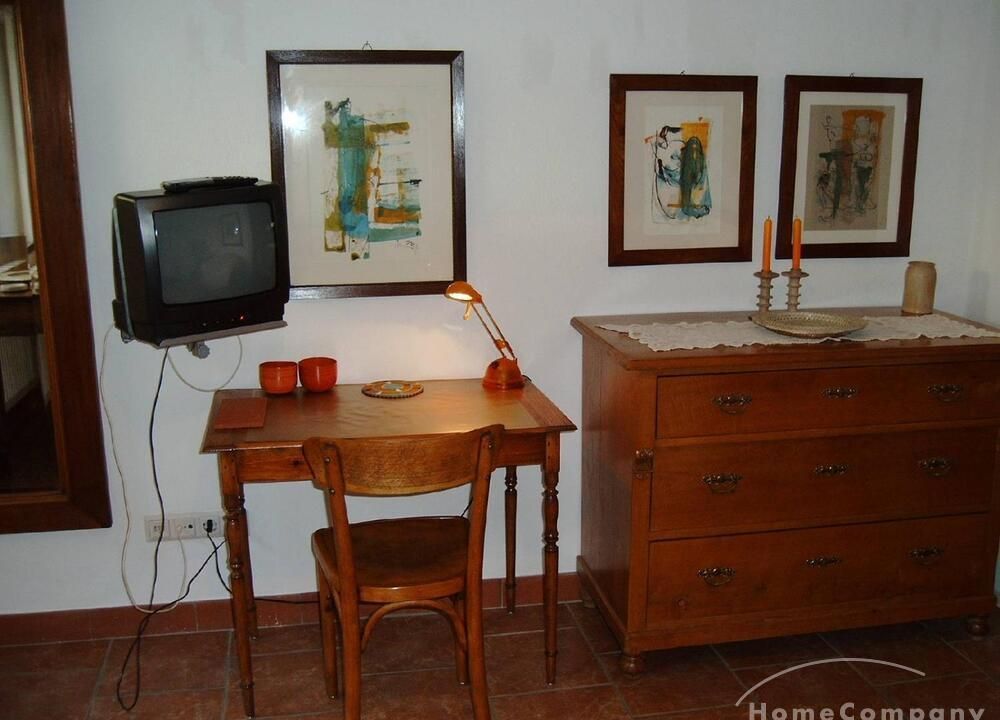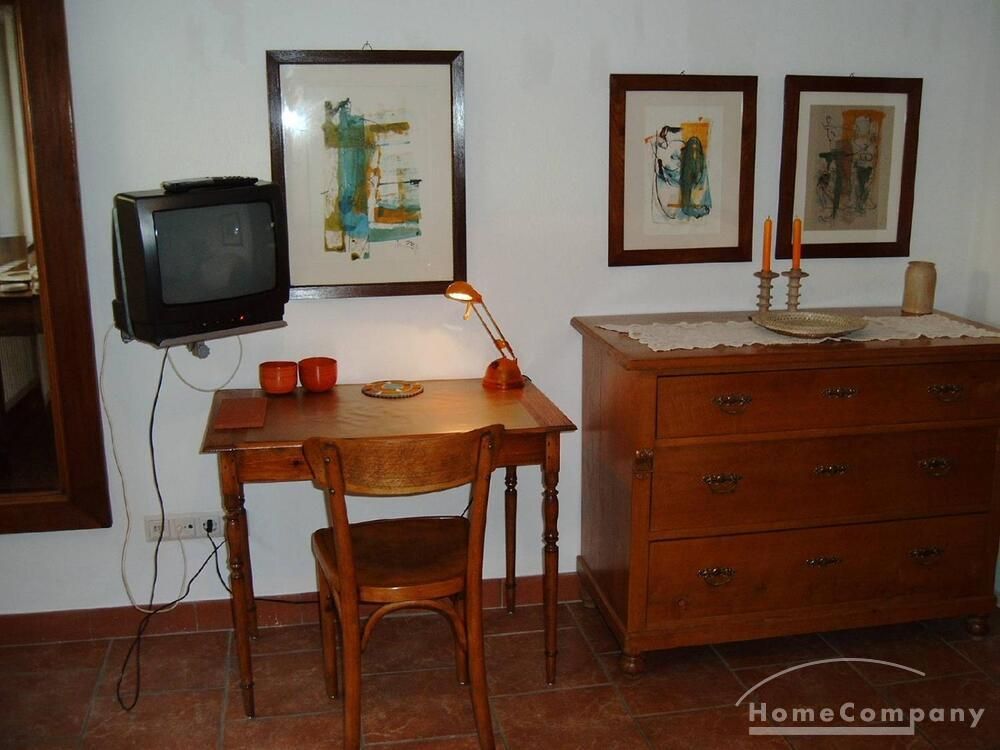 Solides, zeitlos möbliertes Raumwunder, bestehend aus hellem Wohn-/Schlafbereich mit Pantryküche, Essplatz und TV. Das weiß geflieste Badezimmer ist mit einer Dusche ausgestattet.