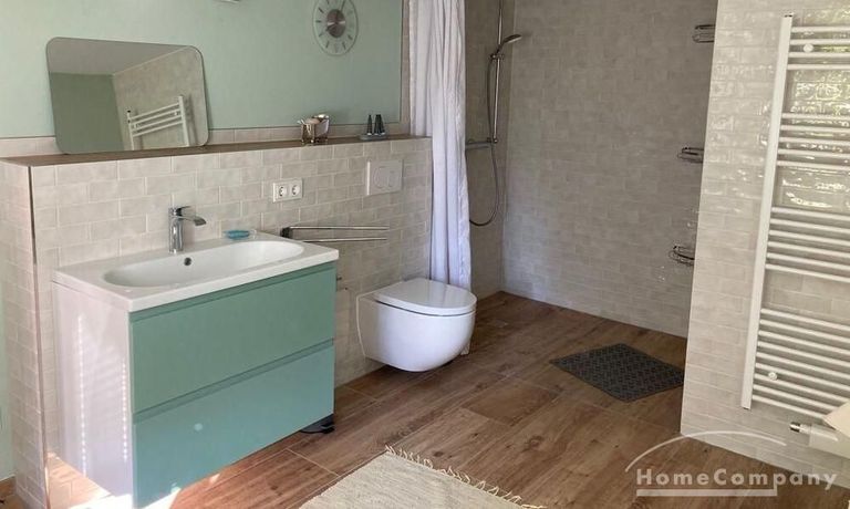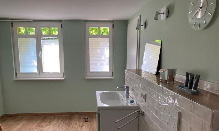 2 Zimmer Wohnung ca. 60 m² mit separatem Eingang, moderner Einbauküche – mit Geschirrspüler und Herd mit Backofen, Esstisch und Stühle, Kaffeemaschine und Wasserkocher, Anrichte und kleine Couch, Schlafzimmer mit Bockspringbett – 1,20 m breit und TV, modernes großzügiges Bad mit Dusche / WC, WASCHMASCHINE, Fenster und Fußbodenheizung, WLAN vorhanden, ohne Bettwäsche und Handtücher, NICHTRAUCHER, kostenloser Parkplatz vorm Haus, sehr ruhige Lage