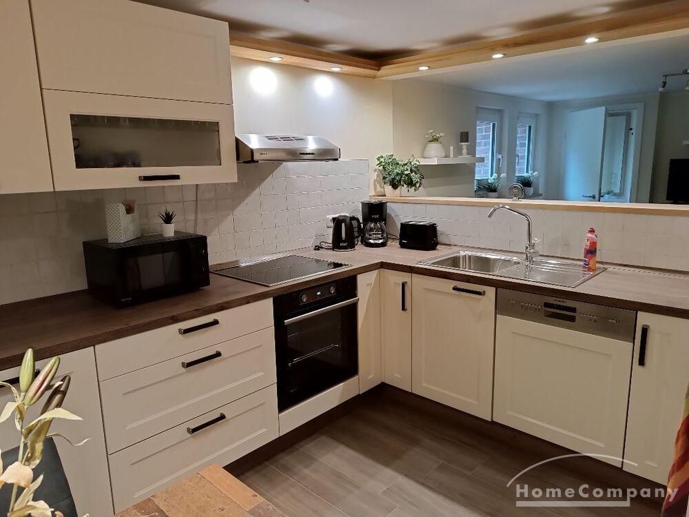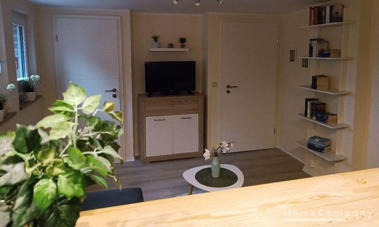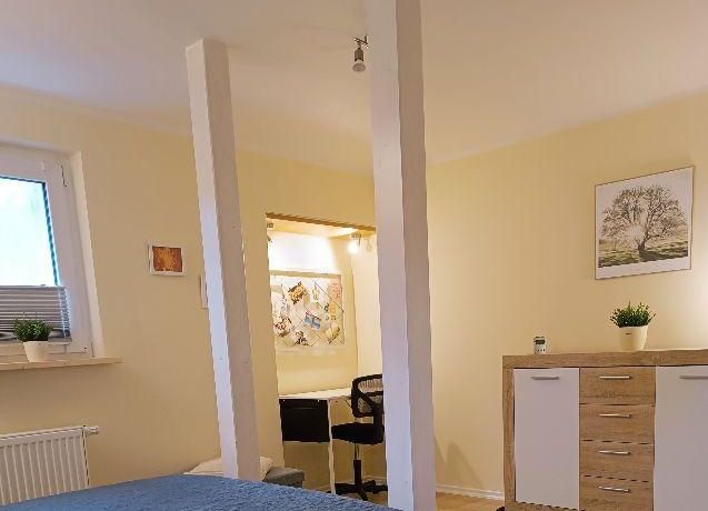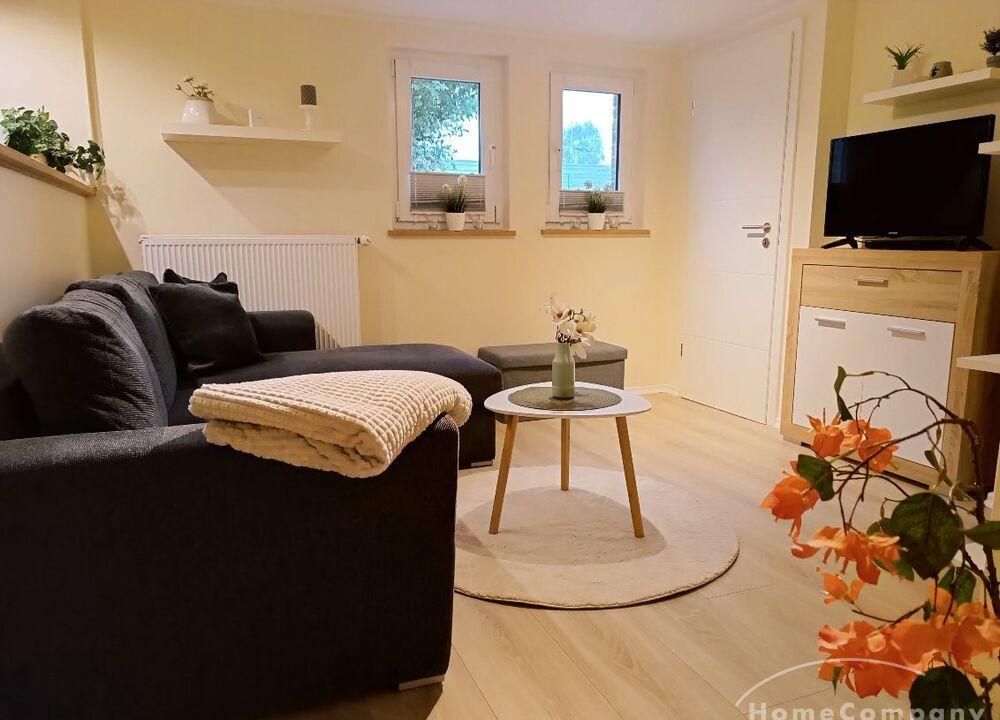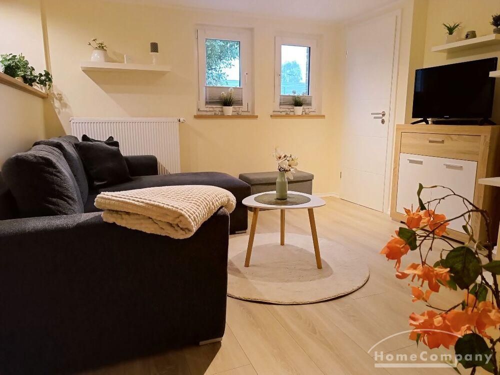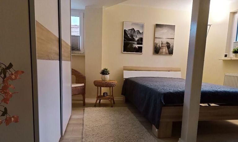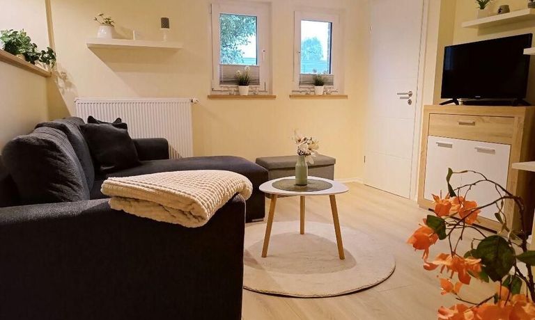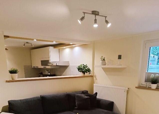 Wohnung im Souterrain eines Stadthauses, kleiner Flur, Wohnraum mit Couch, TV, moderne Küchenecke mit Geschirrspüler, Herd mit Backofen, Esstisch und 2 Stühle,Schlafraum mit Doppelbett, DU/WC, NICHTRAUCHER, WLAN u. Waschmaschine vorhanden,Parkplatz vorm Haus an der Straße