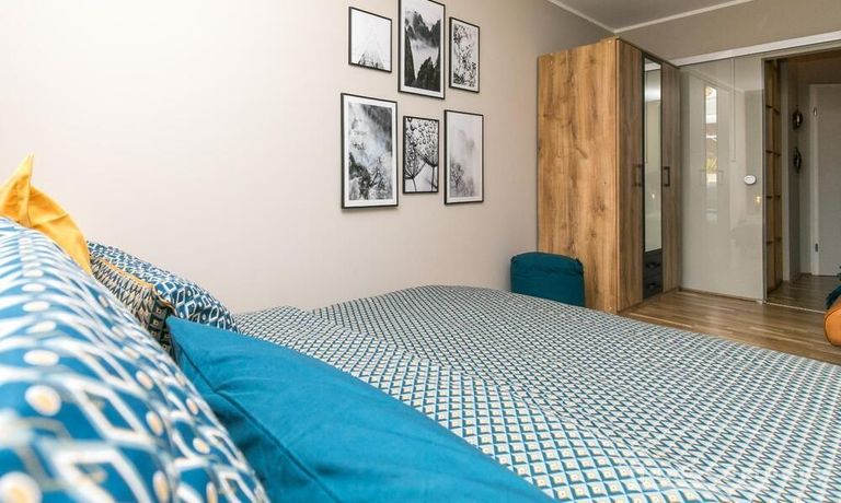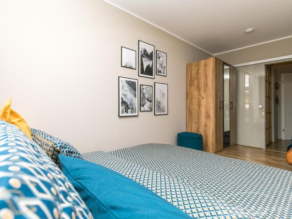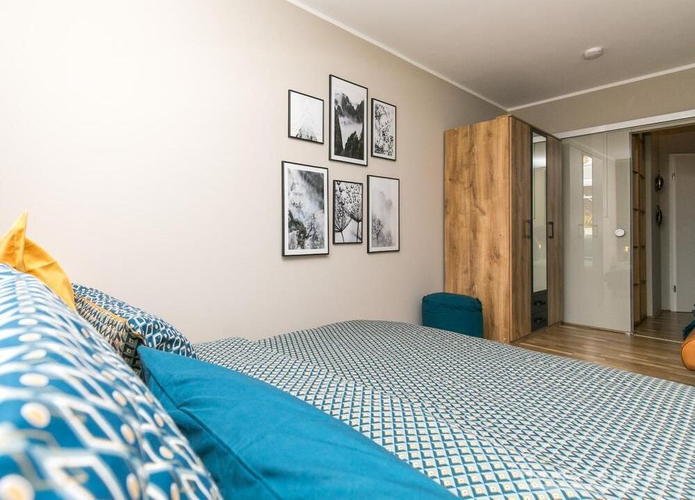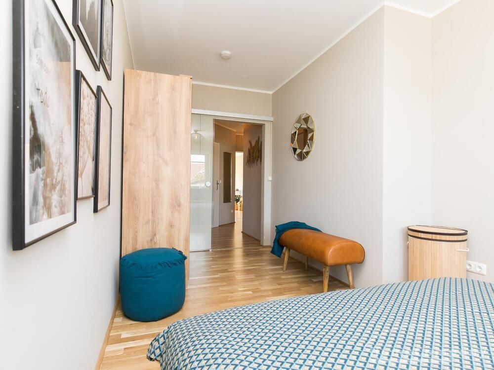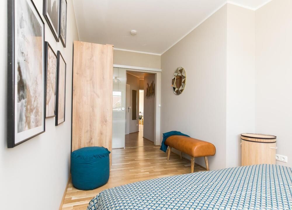 Die angrenzende offene Küche ist komplett ausgestattet. Der Balkon ist ruhig und bietet Platz für 2 Personen. Im Flur gibt es einen begehbaren Kleiderschrank, wo zusätzlich reichlich Schuhe und Haushaltsgeräte einen guten Platz finden. Das Wannenbad ist hell und großzügig und mit einer neuen Glasduschwand ausgestattet. Das Schlafzimmer hat ein Verdunkelungsrollo, ein 1,60 x 2 m großes Bett mit 20 cm hoher, ortopädischer Taschenfederkernmatratze mit Seitenunterstützung, Härtegrad H3 und einem 3-türigen Kleiderschrank mit Kleiderstange, Einlegeböden und zwei Schubladen.