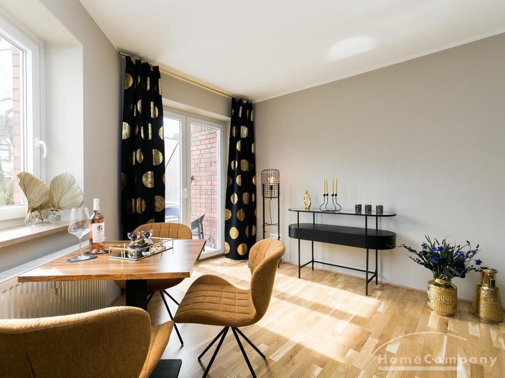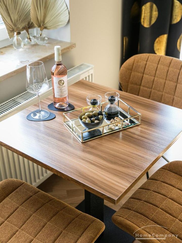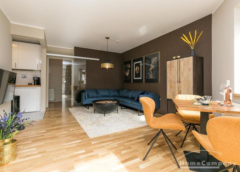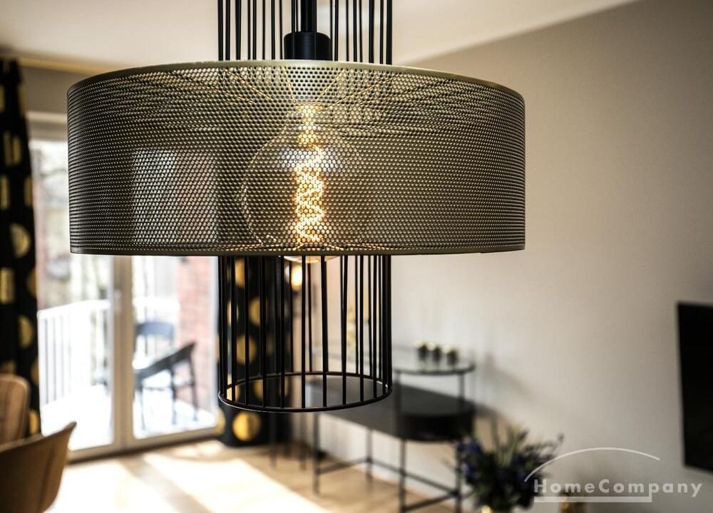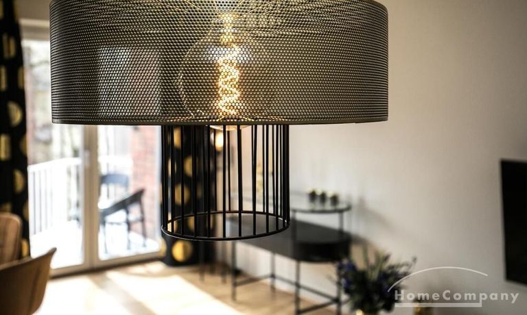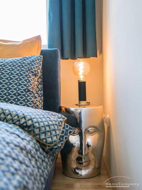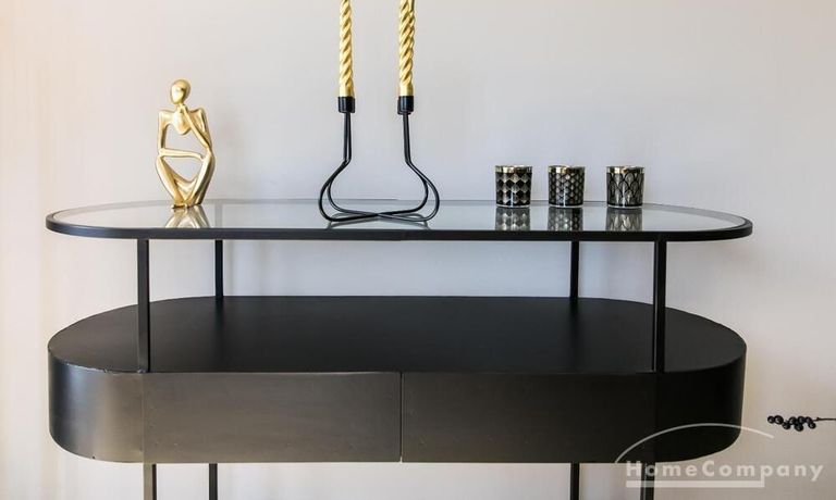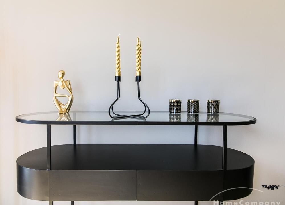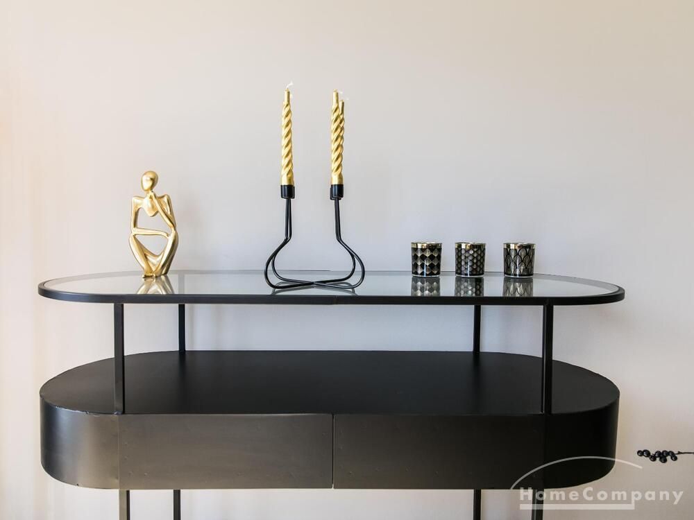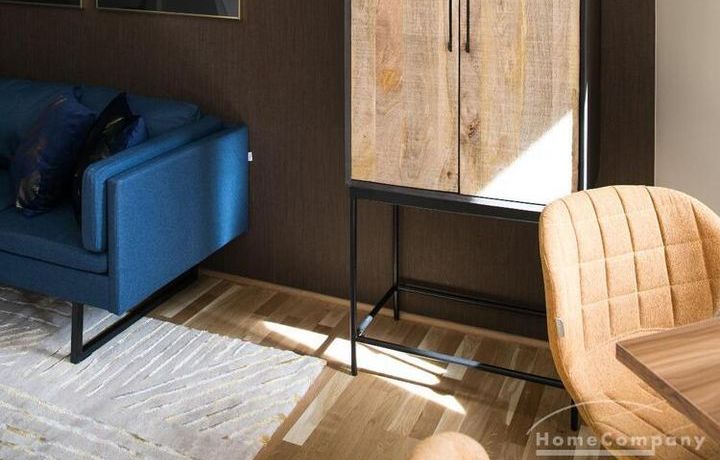 Im Herzen von Hamburg Ottensen und fußläufig zur Elbe gelegene voll möblierte Businesswohnung mit ruhigem Balkon. Die Wände sind in edlem beigegrau „Drop Cloth“ von Farrow & Ball gehalten. Das schöne Eichenparkett und warme Goldtöne, kombiniert mit edlem Blau und Schwarz runden das Ambiente ab. Herzstück des Wohnzimmers ist das große Sofa und der 90 cm große, besondere Couchtisch aus Eisen und Mangoholz. Die schwarz-goldene Hängelampe ist ein weiterer echter Hingucker. Das Highboard aus edlem Mangoholz ist ein außergewöhnliches Modell für gehobene Wohnansprüche. Die geräumige Innenausstattung mit fünf Fächern bietet obendrein viel Platz. Das lässige Konsolen-Sideboard in einem coolen Look ist aus Stahl gefertigt, hat eine Glasplatte und überzeugt durch außergewöhnliches Design.