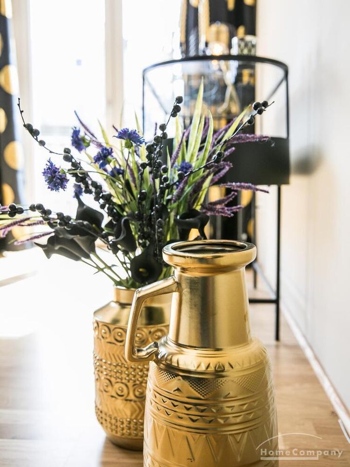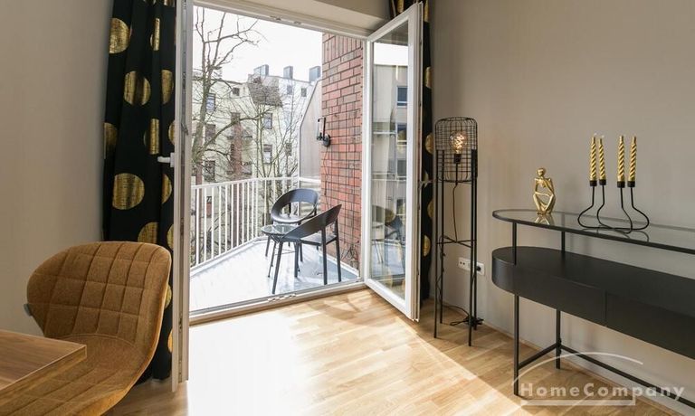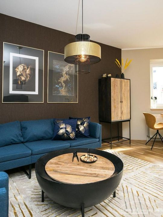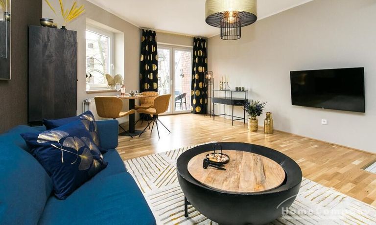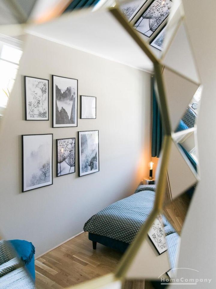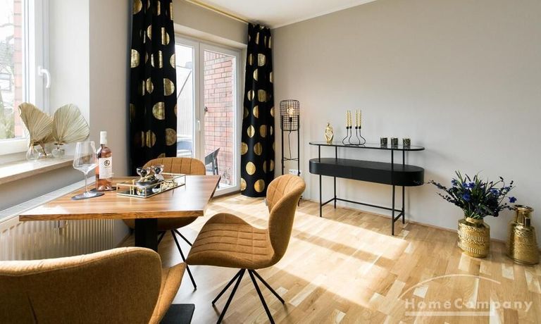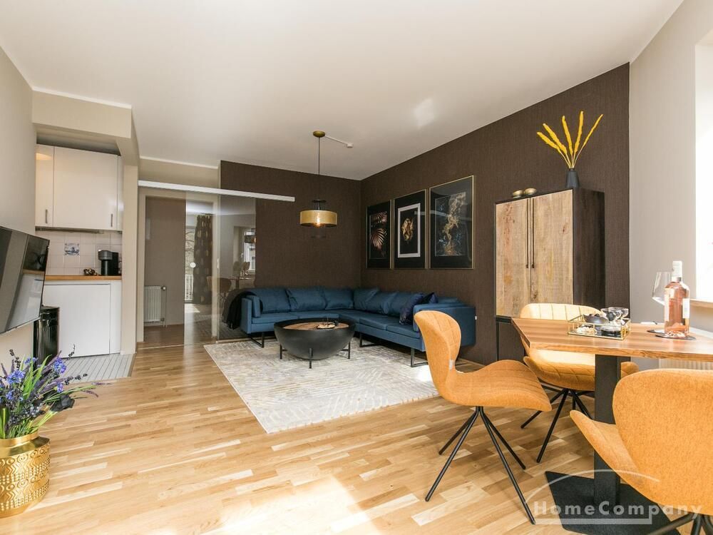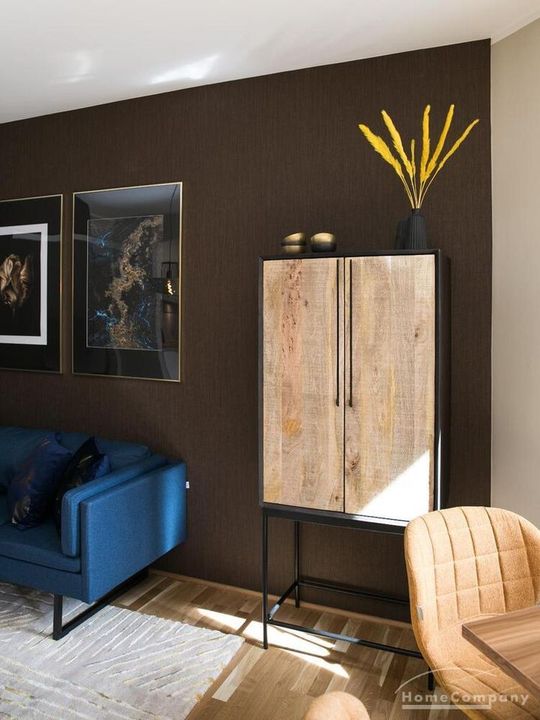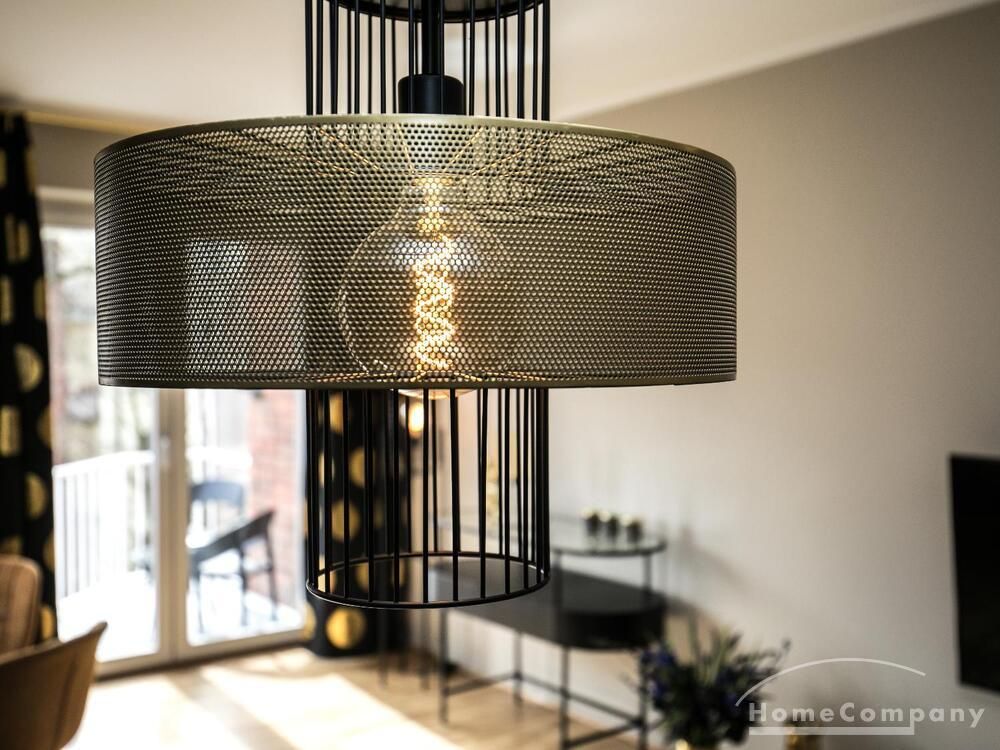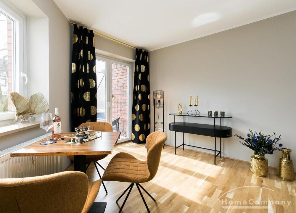 Im Herzen von Hamburg Ottensen und fußläufig zur Elbe gelegene voll möblierte Businesswohnung mit ruhigem Balkon. Die Wände sind in edlem beigegrau „Drop Cloth“ von Farrow & Ball gehalten. Das schöne Eichenparkett und warme Goldtöne, kombiniert mit edlem Blau und Schwarz runden das Ambiente ab. Herzstück des Wohnzimmers ist das große Sofa und der 90 cm große, besondere Couchtisch aus Eisen und Mangoholz. Die schwarz-goldene Hängelampe ist ein weiterer echter Hingucker. Das Highboard aus edlem Mangoholz ist ein außergewöhnliches Modell für gehobene Wohnansprüche. Die geräumige Innenausstattung mit fünf Fächern bietet obendrein viel Platz. Das lässige Konsolen-Sideboard in einem coolen Look ist aus Stahl gefertigt, hat eine Glasplatte und überzeugt durch außergewöhnliches Design.