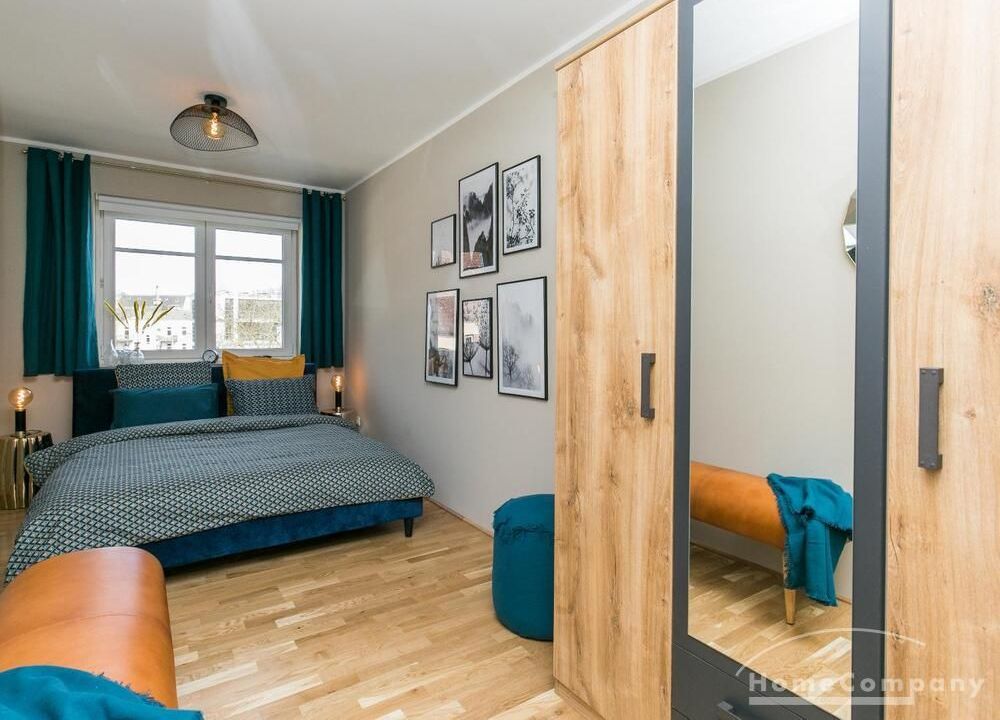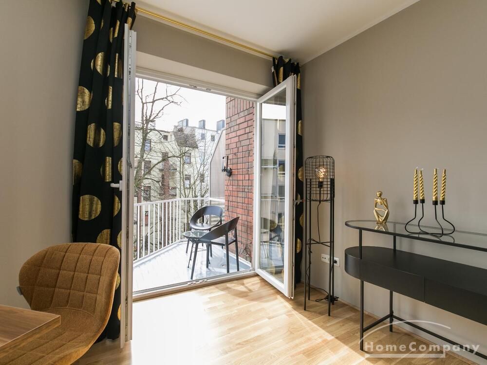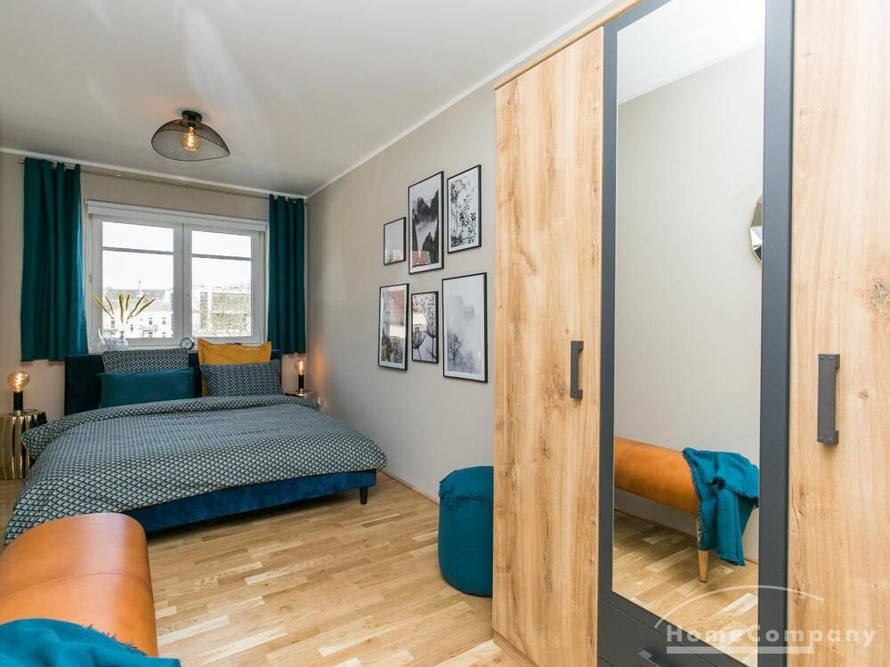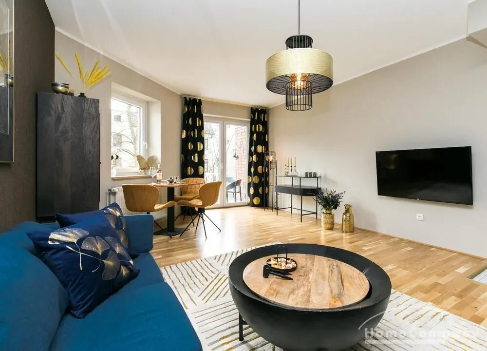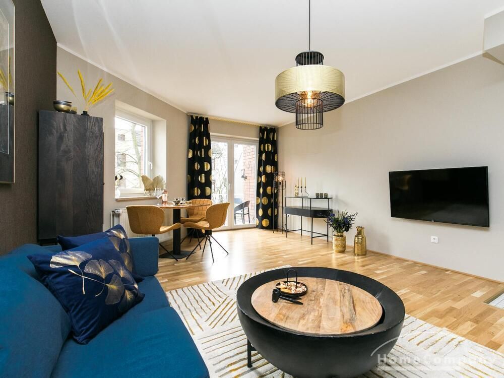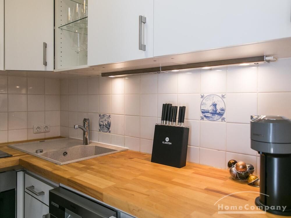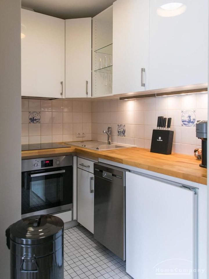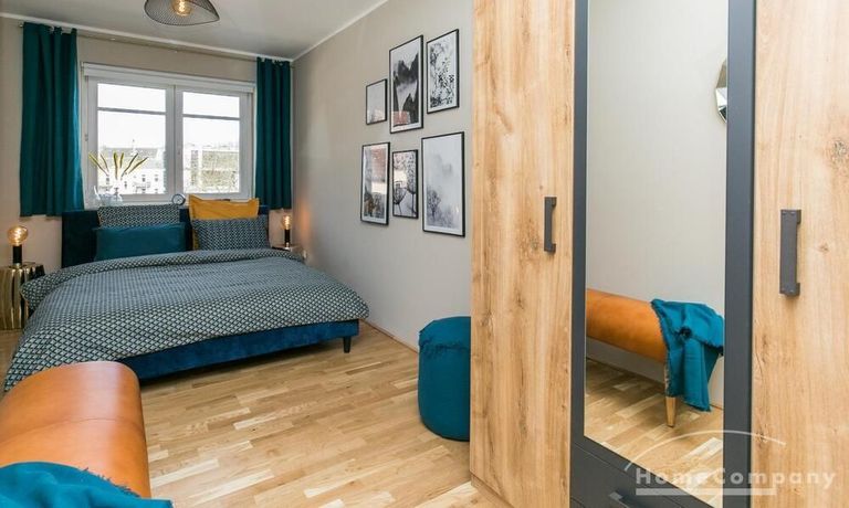 Im Herzen von Hamburg Ottensen und fußläufig zur Elbe gelegene voll möblierte Businesswohnung mit ruhigem Balkon. Die Wände sind in edlem beigegrau „Drop Cloth“ von Farrow & Ball gehalten. Das schöne Eichenparkett und warme Goldtöne, kombiniert mit edlem Blau und Schwarz runden das Ambiente ab. Herzstück des Wohnzimmers ist das große Sofa und der 90 cm große, besondere Couchtisch aus Eisen und Mangoholz. Die schwarz-goldene Hängelampe ist ein weiterer echter Hingucker. Das Highboard aus edlem Mangoholz ist ein außergewöhnliches Modell für gehobene Wohnansprüche. Die geräumige Innenausstattung mit fünf Fächern bietet obendrein viel Platz. Das lässige Konsolen-Sideboard in einem coolen Look ist aus Stahl gefertigt, hat eine Glasplatte und überzeugt durch außergewöhnliches Design.