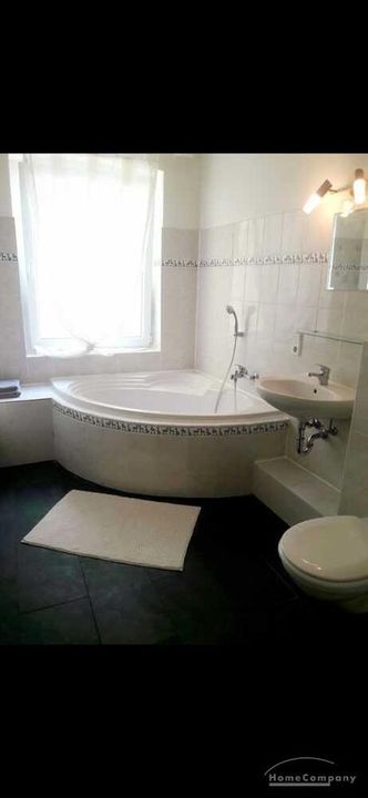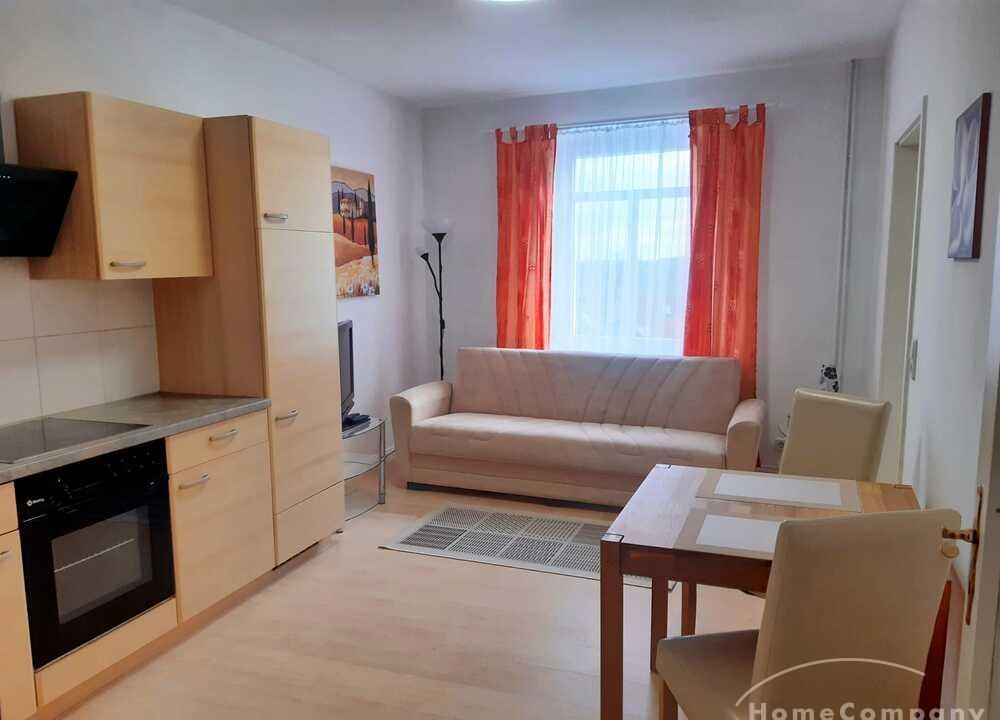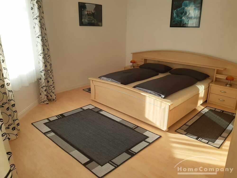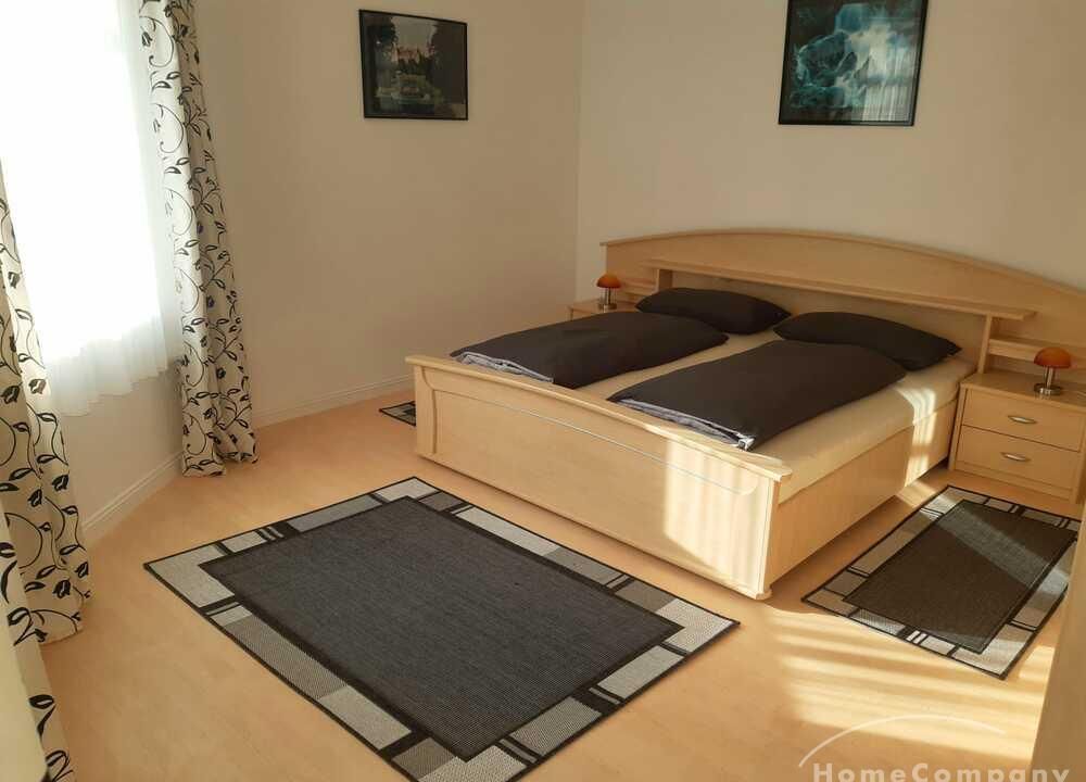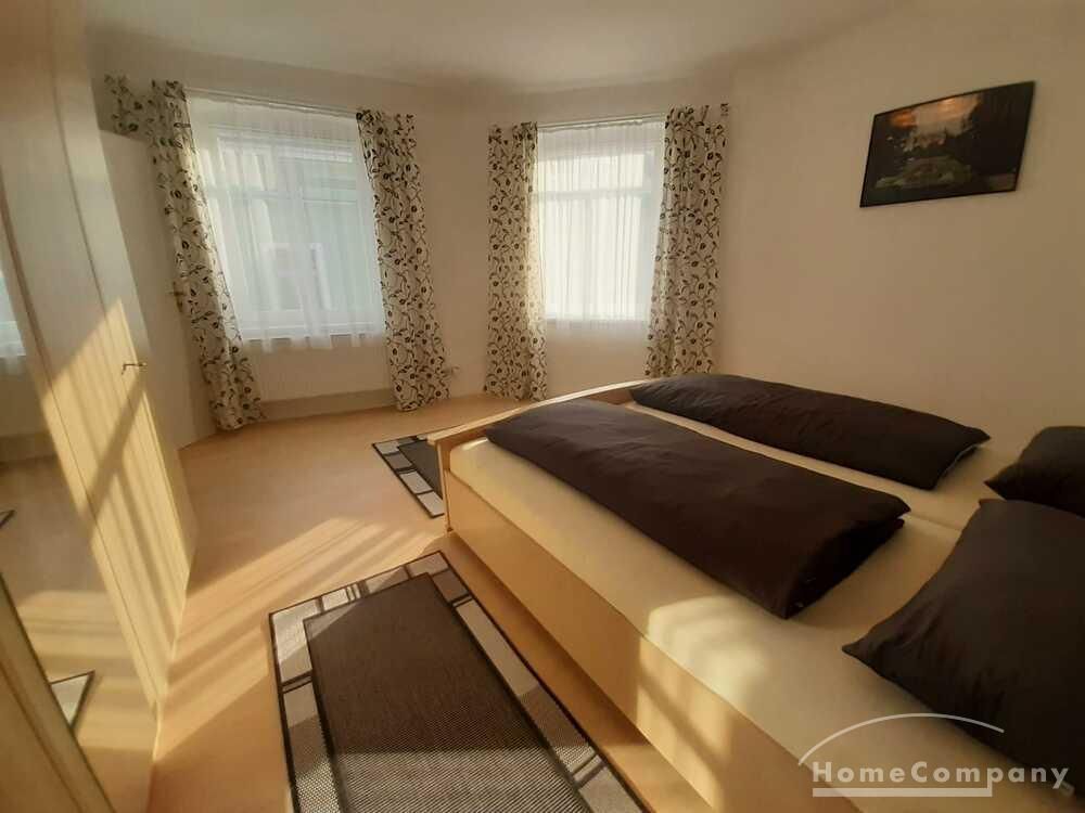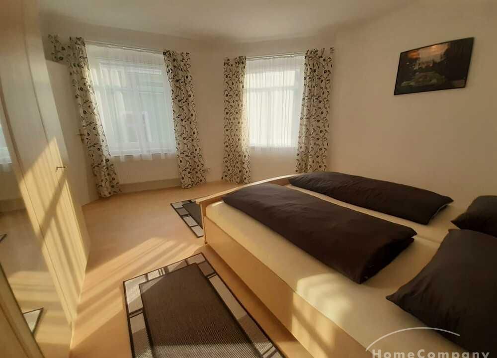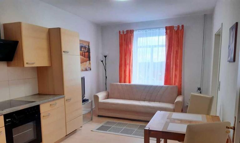 Wohnung in einem Mehrfamilienhaus, Wohnzimmer mit Küchenzeile – Herd mit Backofen, Kühlschrank und Spüle, Esstisch und Stühle, Sitzcouch, TV, WLAN VORHANDEN, Schlafzimmer mit Doppelbett und Kleiderschrank, Bad mit Eckbadewanne und Fenster, Waschmaschine im Keller zur allgemeinen Benutzung – Miete für 2 Pers. pro Monat € 890,00