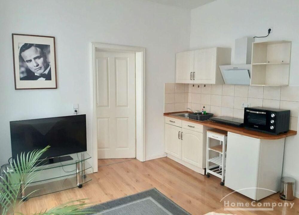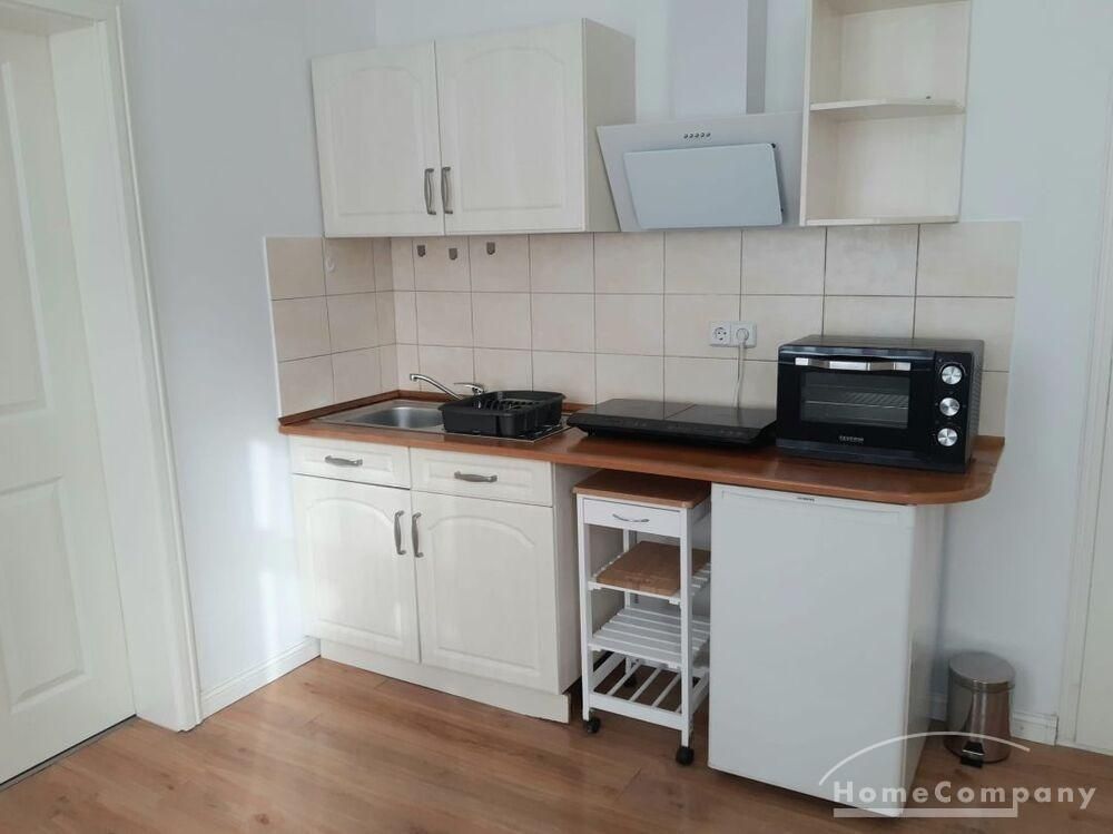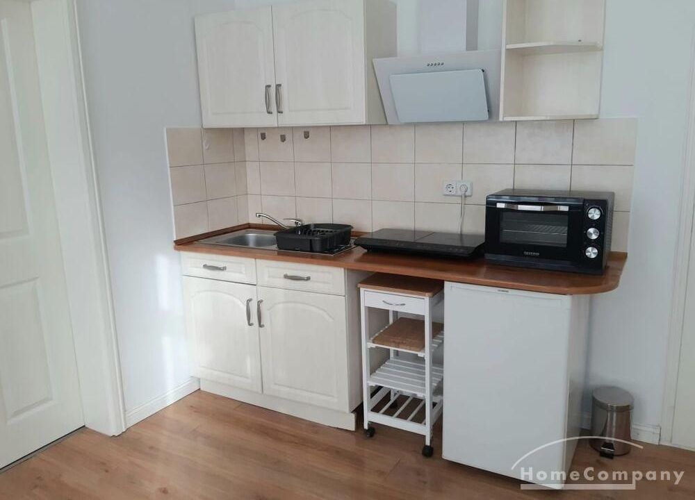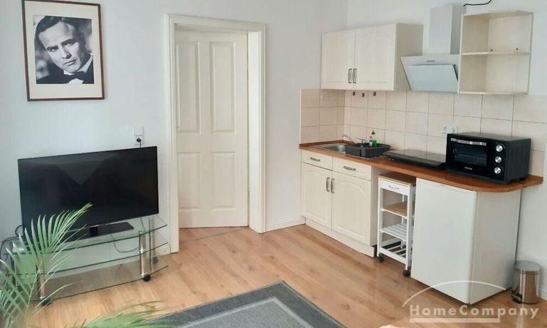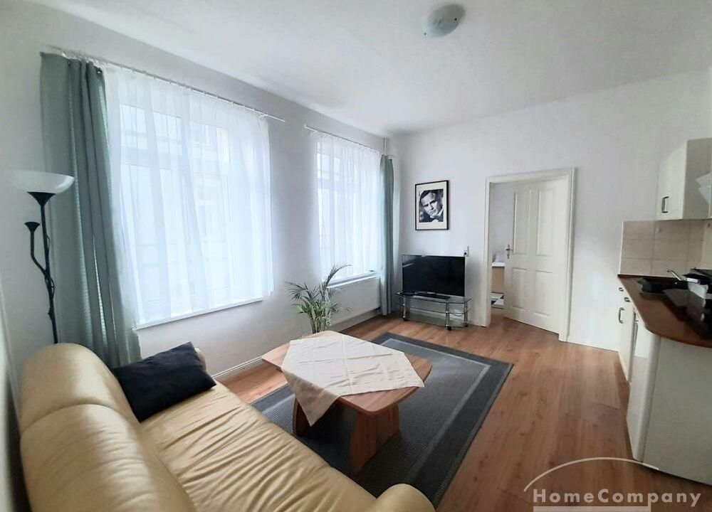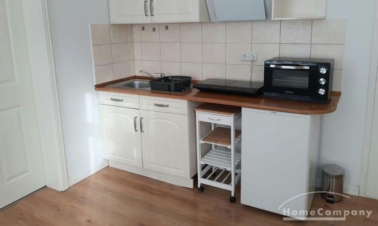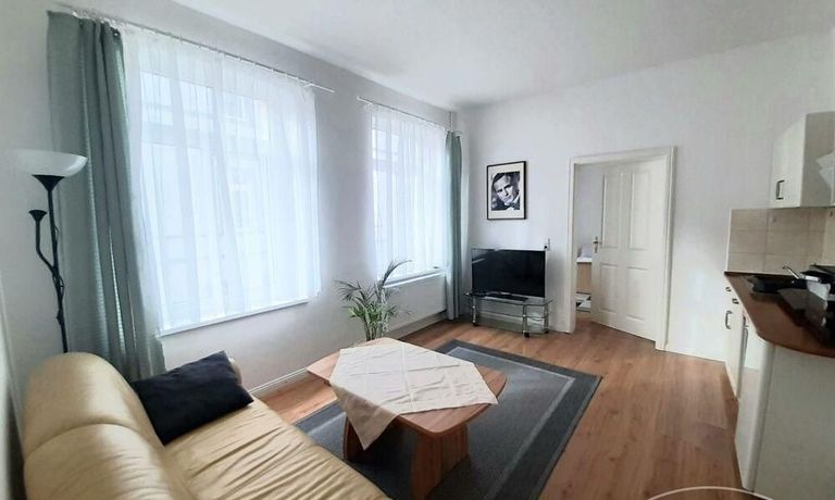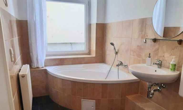 Wohnung in einem Mehrfamilienhaus, Wohnzimmer mit Küchenzeile mit Spüle, Kühlschrank, Herd mit Backofen, Esstisch, Stühle, Couch, TV, Schlafzimmer mit Doppelbett und Kleiderschrank, Bad mit Eckbadewanne und Fester, WLAN VORHANDEN, Waschmaschine im Keller zur allgemeinen Benutzung – Miete für 2 Personen pro Monat € 890,00