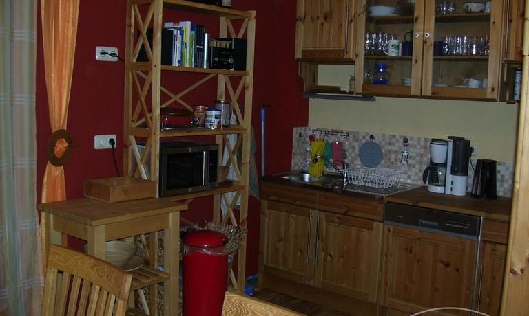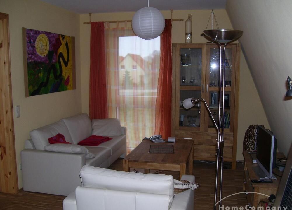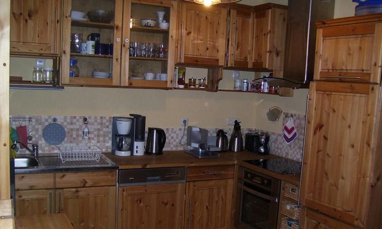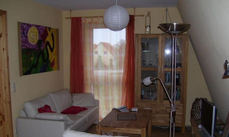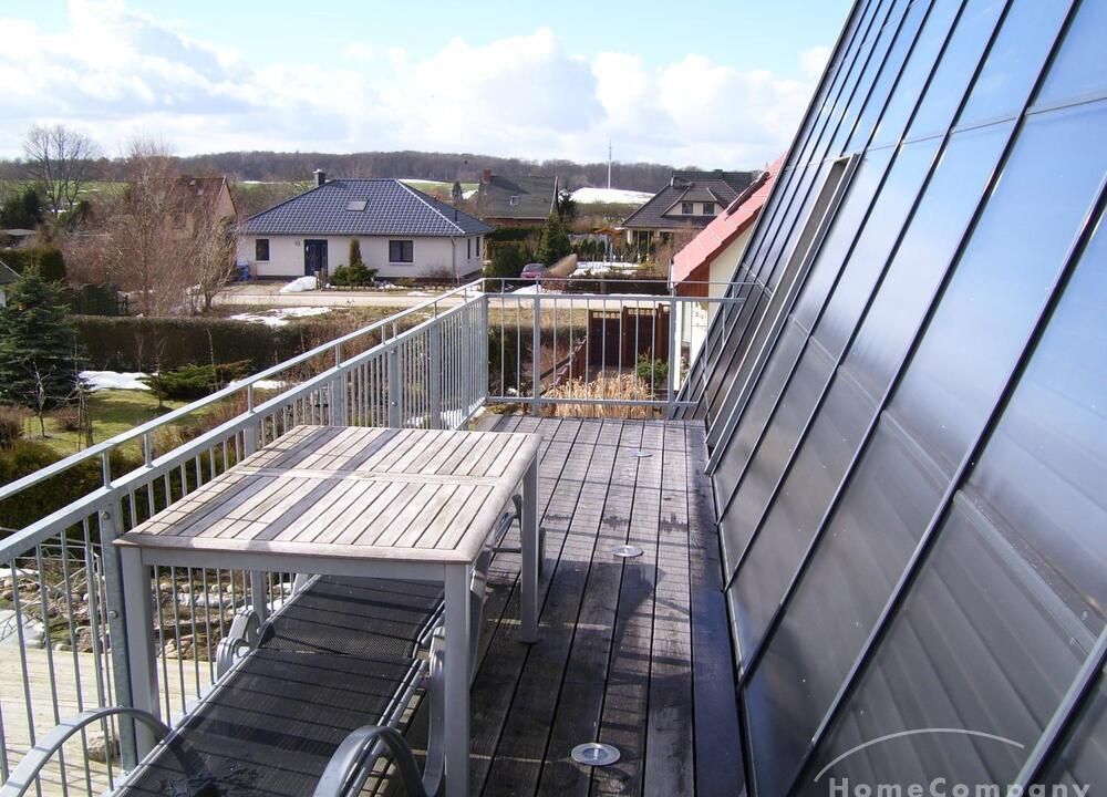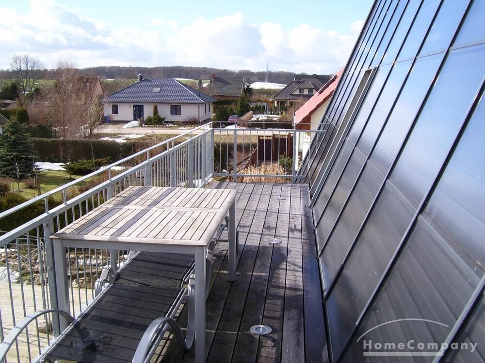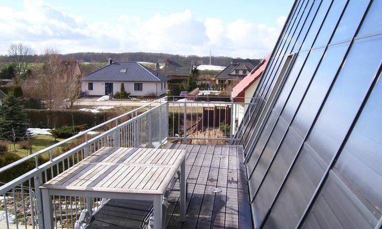 Wohnung in einem Solarhaus über 2 Etagen mit DACHTERRASSE, Wohnraum mit Sitzecke, LCD TV, Einbauküche komplett ausgestattet mit Geschirrspüler, Schlafzimmer mit Doppelbett und Kleiderschrank, Gäste WC mit Dusche, über eine Treppe gelangt man ins DG – kleines Zimmer mit Bett und Schreibtisch, Bad mit Waschmaschine und Trockner, Sauna
