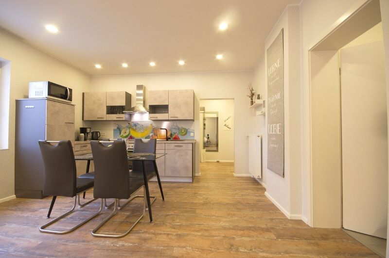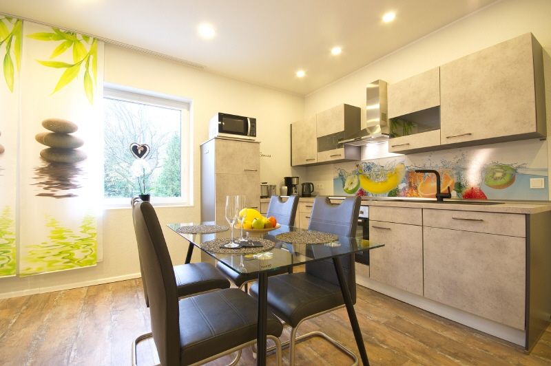 Die moderne Einbauküche bietet eine umfassende Ausstattung mit Spülmaschine, Backofen, Herd, Kühl-Gefrier-Kombination, Mikrowelle und Kaffeemaschine. Geschirr und Besteck sind ebenfalls vollständig vorhanden. Der angrenzende Wohnraum lädt zum Entspannen und Wohlfühlen ein.