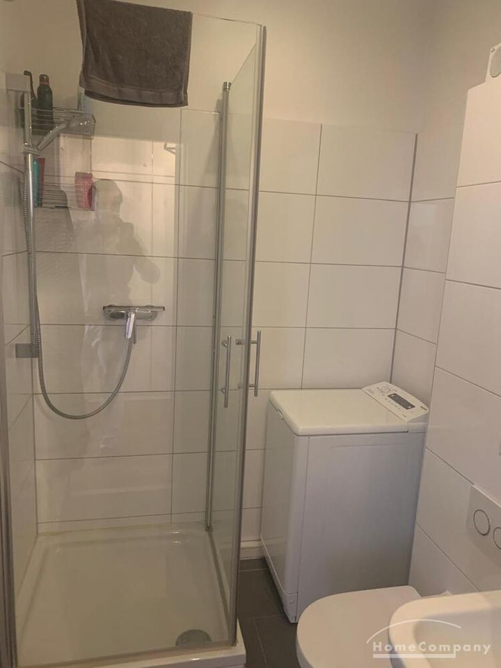 Das hell geflieste Bad verfügt über eine Dusche; hier befindet sich auch die eigene Waschmaschine.