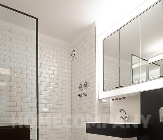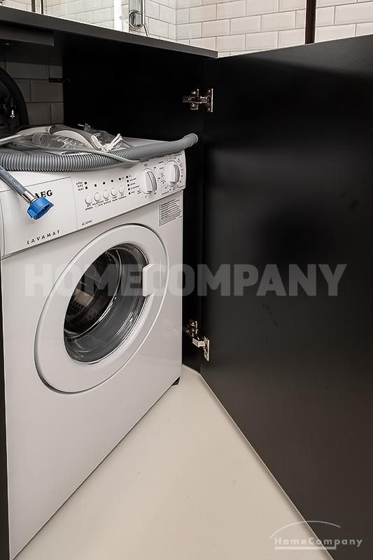 Das zeitlos schwarz-weiß gestaltete Badezimmer verfügt über eine Badewanne-Duschkombination, genügend Stauraum und eine eigene Waschmaschine. Die gesamte Wohnung ist qualitativ sehr hochwertig ausgestattet und versprüht einen besonderen Charme.
