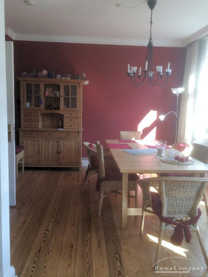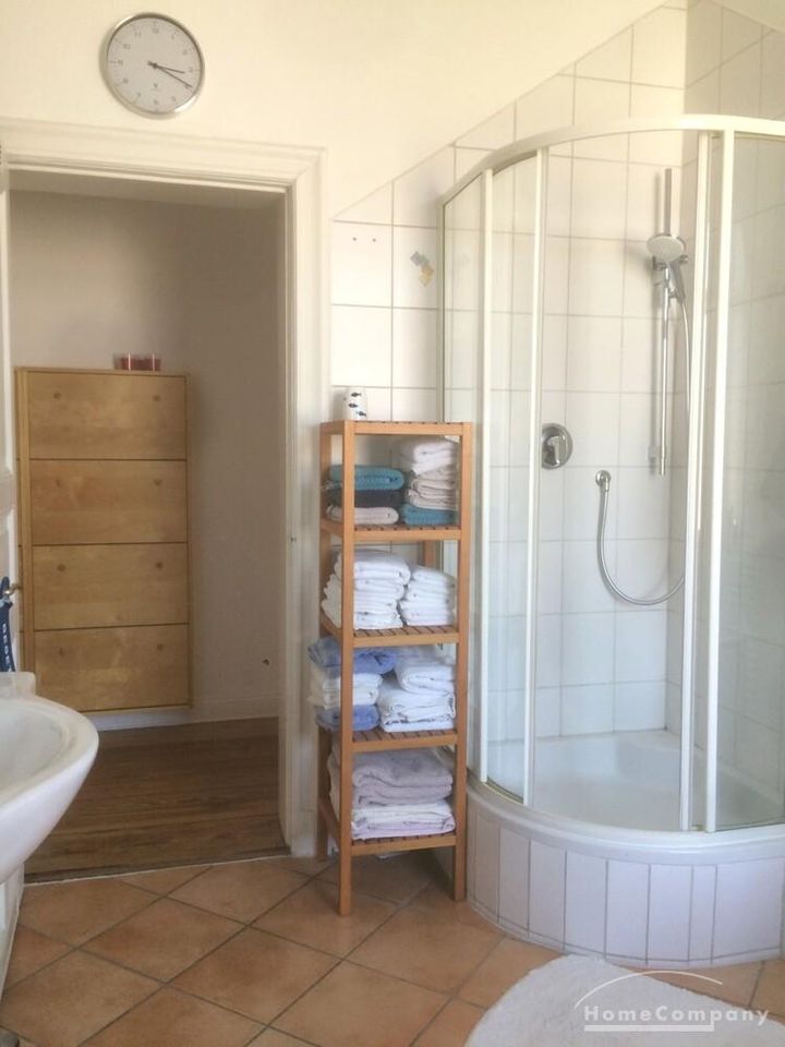 Im Schlafzimmer stehen ein Bett (1,40m breit), Kleiderschrank und Kommode zur Verfügung. Im Ess-/Wohnzimmer sind der Vitrinenschrank und die Bücherregale belegt, eine Regalwand ist frei. Die Küche ist voll ausgestattet (Geschirr, Töpfe etc.). Handtücher und Bettwäsche können gestellt werden.