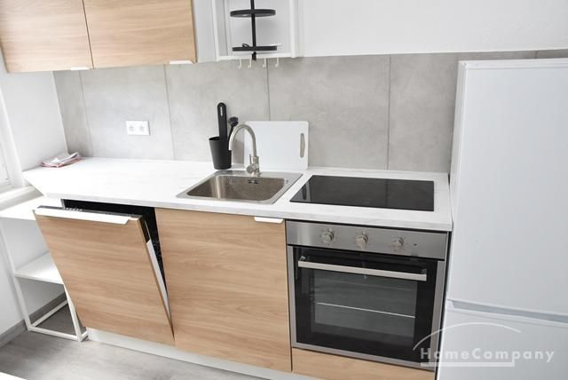 Einbauküche, komplett ausgestattet mit Geschirrspüler, E-Herd mit Cerankochfeld und neuer Arbeitsplatte, Dunstabzugshaube, Kühl-/Gefrierschrank, Tisch mit 2 Stühlen.
